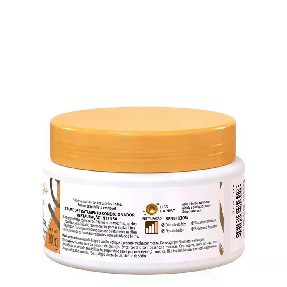 A máscara de Hidratação Meu Liso Restauração Intensa contém fórmula poderosa para combater 7 danos extremos dos cabelos lisos ou alisados: cabelos fragilizados, fios com pontas duplas, ressecamento, frizz, elasticidade, quebra e opacidade!