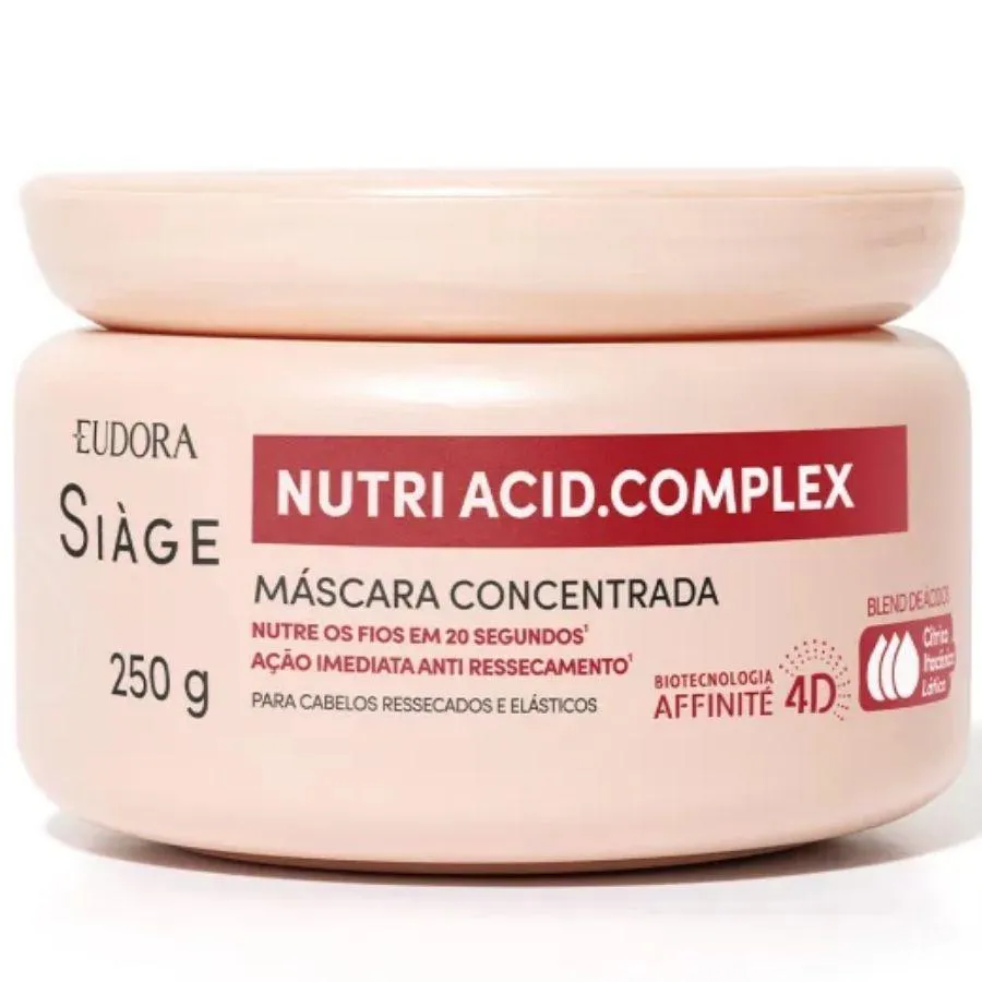 máscara Capilar Concentrada Siàge Nutri Acid.Complex 250g A Máscara Capilar Concentrada Siàge Nutri Acid.Complex, enriquecida a 5% do blend de ácidos com óleos, nutre desde o interior da fibra capilar e blinda a superfície dos fios, protegendo contra o ressecamento. Ideal para cabelos ressecados e elásticos, outros benefícios da máscara concentrada Siàge Nutri Acid.Complex incluem: Reposição nutri lipídica imediata; Nutre desde o interior da fibra capilar e blinda a superfície dos fios; Fios com 59% mais brilho; Fios 74% mais macios; Proteção contra o ressecamento e a oxidação.