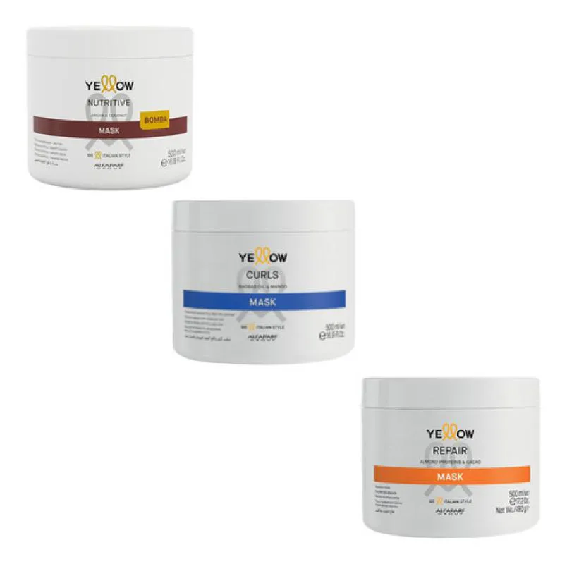 Este Kit Contém 1 máscara Yellow Nutritive 500g 1 Máscara Yellow Curls 500g 1 Máscara Yellow Repair 500g MÁSCARA CONDICIONADORA YELLOW NUTRITIVE Bomba Nutritiva – Cabelos Secos Uma Verdadeira Bomba Até Mesmo Para O cabelo Mais Seco A Sua Textura Com corpo, Em Poucos Minutos, Dá Vida A Uma Explosão De Nutrição, Maciez E Lucidez. MÁSCARA HIDRATANTE PARA CABELOS CACHEADOS Máscara de hidratação intensa e efeito anticrespo PARTICULARMENTE RICA EM PRINCÍPIOS ATIVOS, É PERFEITA PARA DAR UMA HIDRATAÇÃO INTENSA E DEFINIÇÃO NOS CACHOS MODO DE USO COM O CABELO ÚMIDO, APLICAR AO LONGO DOS COMPRIMENTOS E DAS PONTAS. DEIXAR AGIR DE 2 A 3 MINUTOS. ENXAGUAR. MÁSCARA YELLOW REPAIR - MÁSCARA REPARADORA PARA CABELOS danificados MÁSCARA YELLOW REPAIR - REESTRUTURAÇÃO PARA CABELOS EXTREMAMENTE DANIFICADOS FÓRMULA ENCORPADA PARA UM REPARO EM PROFUNDIDADE DE DENTRO PARA FORA; REPARA A FIBRA E SELA A CUTÍCULA. OS CABELOS APARECEM REVITALIZADOS, MAIS DESEMBARAÇADOS E BRILHANTES. MODO DE USO COM O CABELO ÚMIDO, APLICAR NO COMPRIMENTO E PONTAS. DEIXAR ATUAR DURANTE 3/5 MINUTOS… ENXAGUAR. NÃO CONHECE A YELLOW?! Somos a Marca Italiana mais tradicional e com melhor custo benefício no setor em Cosmética Capilar