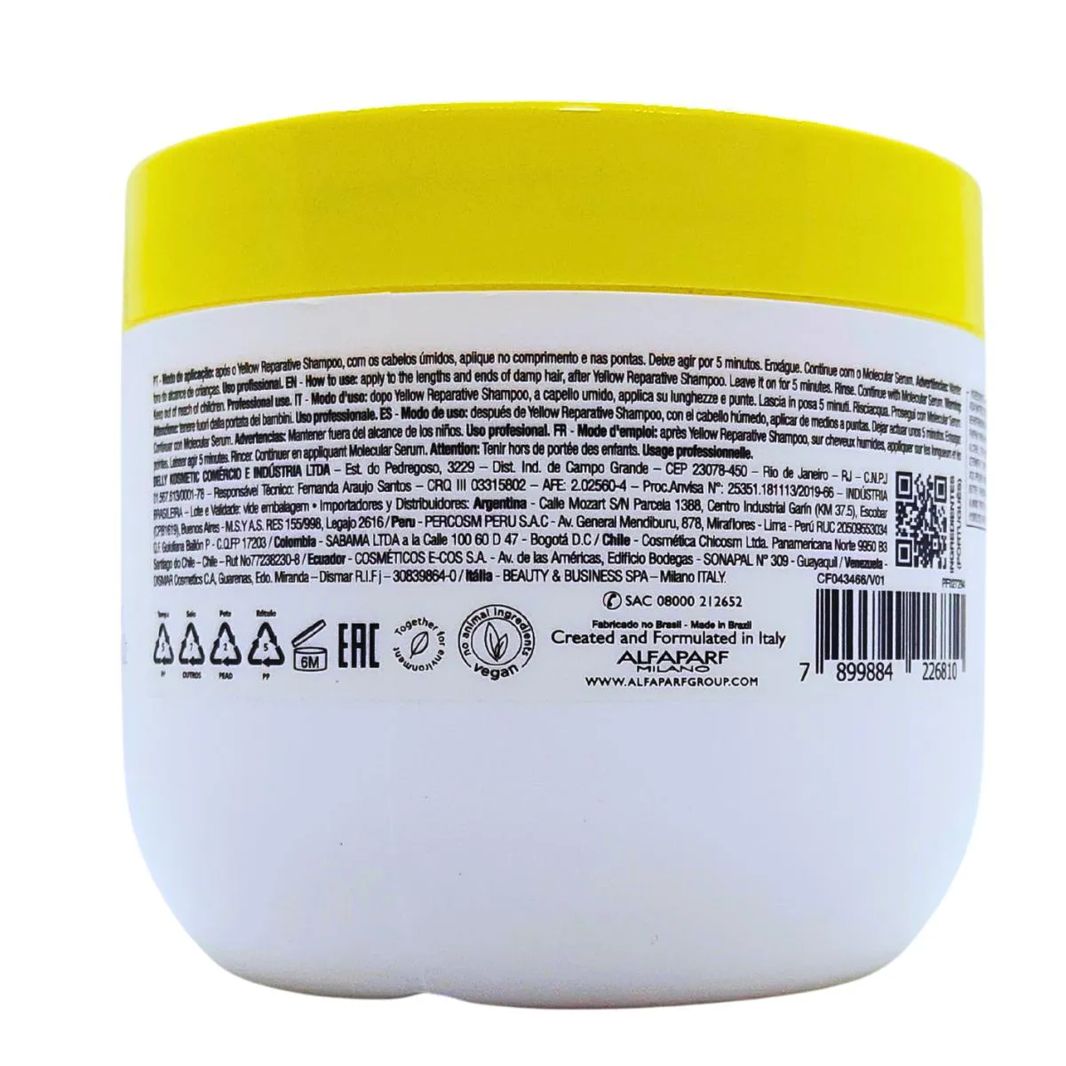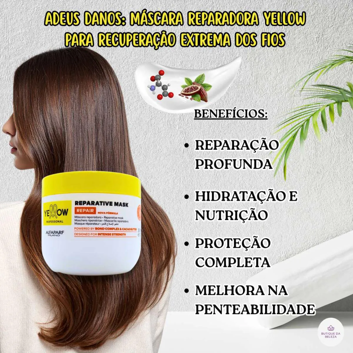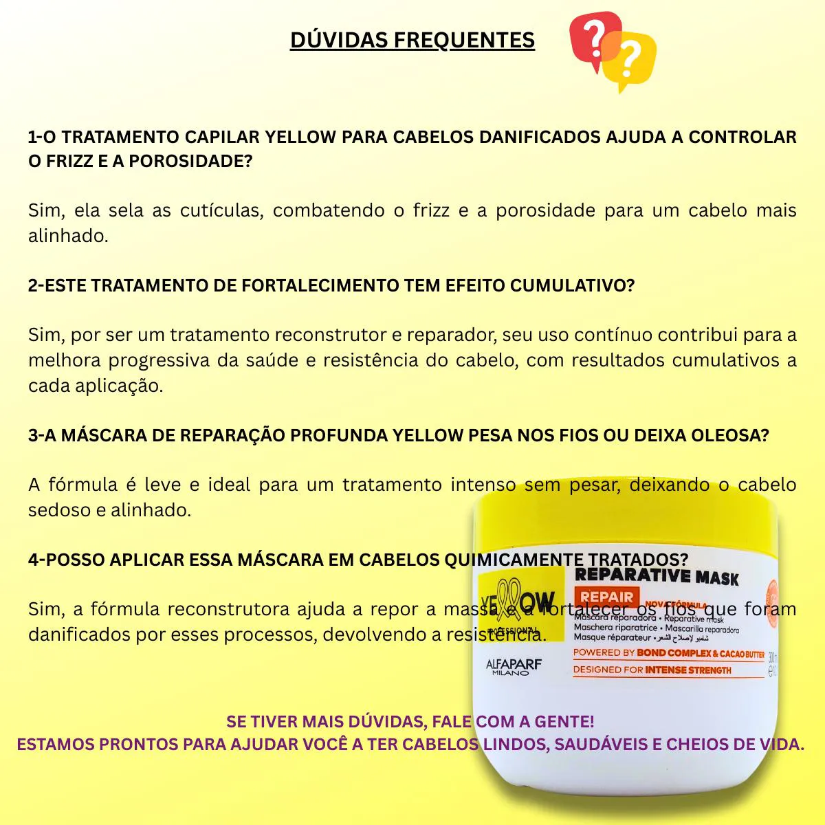 DÚVIDAS FREQUENTES: A máscara Yellow Repair pesa os fios? Não. Sua fórmula é equilibrada para proporcionar nutrição intensa sem deixar os cabelos oleosos ou pesados, mesmo em cabelos mais finos. Pode ser usada em cabelos loiros ou descoloridos? Sim. É ideal para cabelos loiros, descoloridos ou fragilizados por processos de clareamento, pois ajuda a restaurar a fibra e prevenir a quebra. Quantas vezes por semana devo usar? Recomenda-se de 1 a 2 vezes por semana, ou conforme a necessidade do seu cabelo. Em casos de danos severos, pode ser usada até 3 vezes na semana por um período de tratamento intensivo. É indicada para cabelos com progressiva ou coloração? Sim. A máscara é altamente recomendada para cabelos que passaram por coloração, progressiva, botox capilar ou qualquer outro tipo de química, pois repõe massa e hidrata profundamente. É liberada para técnicas low poo? Não. A fórmula contém silicones e outros agentes reconstrutores que não são compatíveis com a técnica low poo.