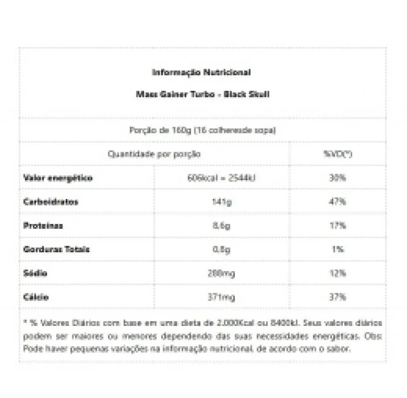 Mass Gainer Turbo Refil (1,6kg) O Mass Gainer da linha Caveira Preta Series é o novo suplemento da Black Skull, contendo ingredientes de qualidade que promovem o ganho e a construção muscular, oferecendo mais energia e força. Com 16 gramas de proteínas, 128 gramas de carboidratos e 603 calorias por dose. O hipercalórico é clássico para praticantes de musculação, e é um suplemento indicado para quem deseja obter ganho de massa muscular de forma rápida. Eles são compostos por altas quantidades de carboidratos de alto e baixo índice glicêmico, proteínas de alto valor biológico, aminoácidos, vitaminas e minerais dentre outros nutrientes. Mass Gainer Turbo, o hipercalórico que vai trazer Ganho de Massa! Benefícios: * Efetiva o ganho de massa muscular;* Eleva as calorias diárias;* Proporciona o aumento de peso.