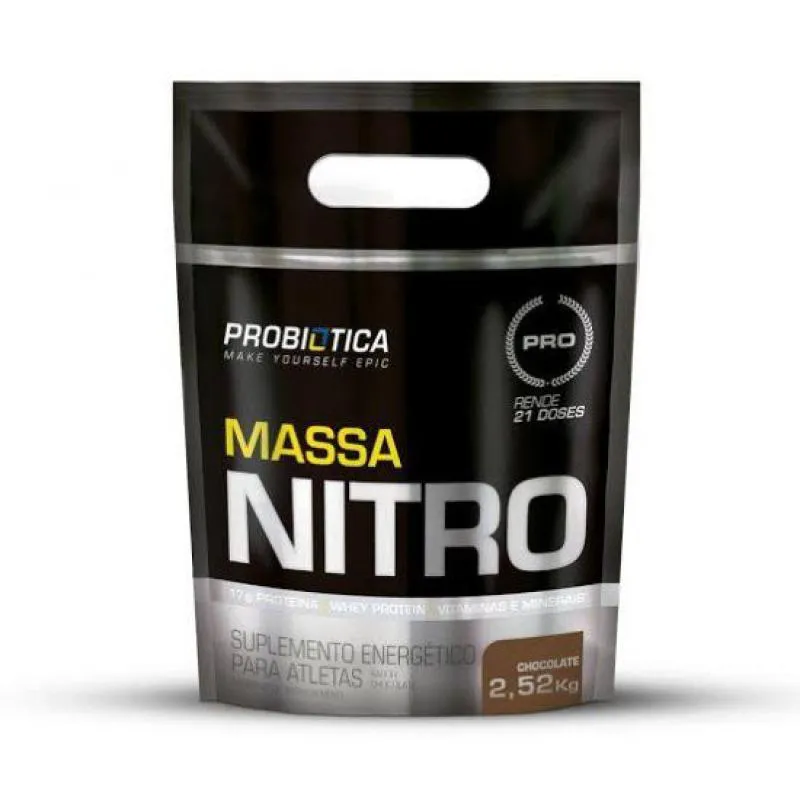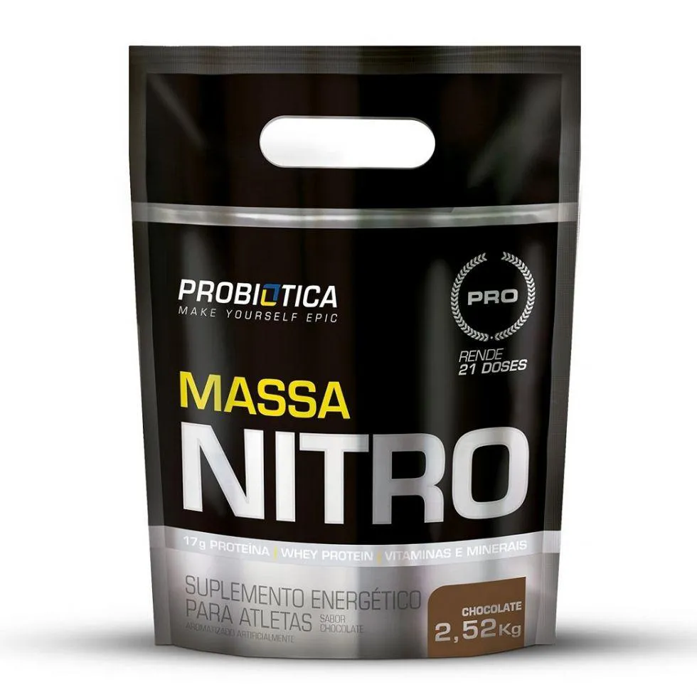 Massa Nitro - Probiótica Massa Nitro da Probiótica é um suplemento especialmente desenvolvido com uma combinação de proteínas específicas e específicas do soro do leite, clara de ovo (albumina), proteína isolada de soja e caseinato, resultando em um perfil de aminoácidos de elevada digestibilidade. Ele também contém diversos carboidratos na composição contendo para manutenção dos níveis de energia constante além de vitaminas e minerais, que garantem, na porção diária de 360g (3 shakes), 100% da ingestão diária recomendada. Massa Nitro te auxilia no ganho de peso saudável, aumento de massa muscular e força, e seu diferencial está em sua composição. Composto pela fórmula NITROPRO, desenvolvido e desenvolvido pelos especialistas laboratoriais da Probiótica, concentra diversos ingredientes que participam da formação do óxido nitrido (NO). Massa Nitro é o suplemento ideal para acelerar seus resultados! Benefícios: * Acelera o processo do ganho de massa magra; * Melhora o desempenho durante o treino. * Ajuda na recuperação de tecido muscular; * Contém 16g de proteínas; * Contém vitaminas e minerais.