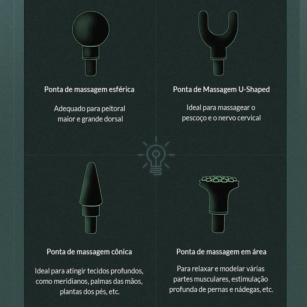 Vibração de alta frequência em velocidades: o músculo massageador pode efetivamente reduzir a rigidez e a dor muscular, aumentar o fluxo sanguíneo e amplitude de movimento e melhorar a saúde dos tecidos moles do corpo.6 Modos Com 4 pontas.