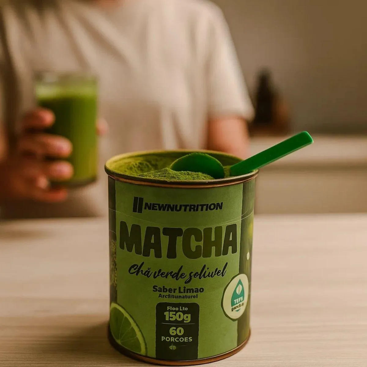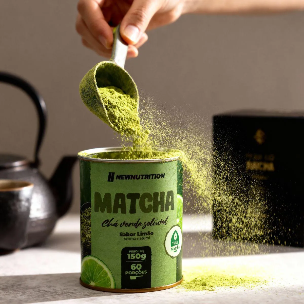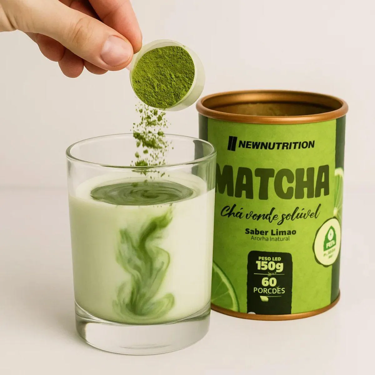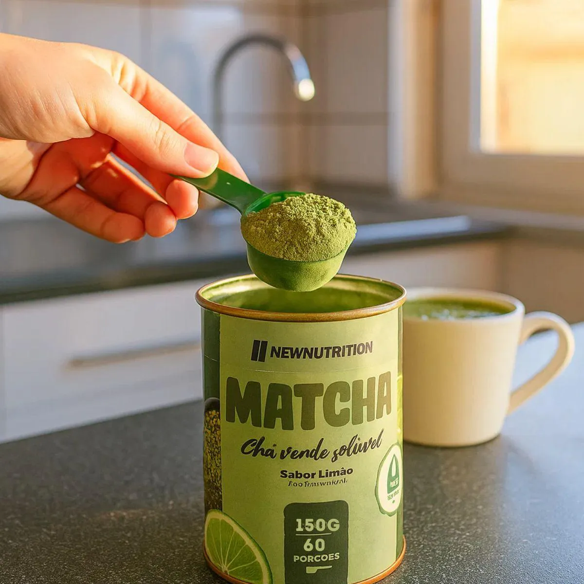 Matchá Chá Verde Soluvel Com Stevia 150g New Nutrition pó solúvel de matchá com 80 g por embalagem, pronto para dissolver em água quente ou fria.