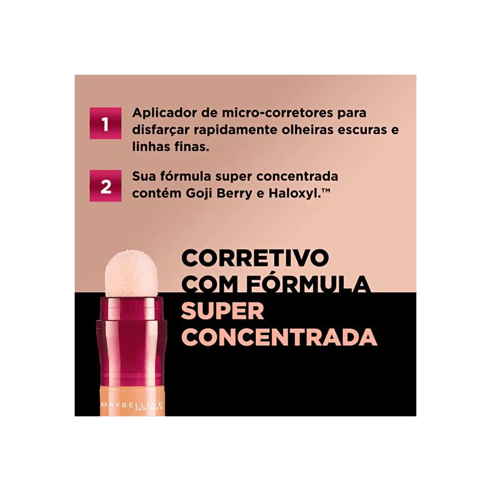 Maybelline Instant Age Rewind Eraser Dark Circles - Corretivo Líquido une os efeitos instantâneos da maquiagem com o cuidado dos ativos anti-idade. Além disso, conta com uma fórmula incrível com Goji Berry que hidrata, restaura a proteção natural da pele e protege do envelhecimento precoce e Haloxyl que reduz os pigmentos sanguíneos que causam as olheiras. Possui efeito anti-inflamatório e reforça a firmeza da pele.