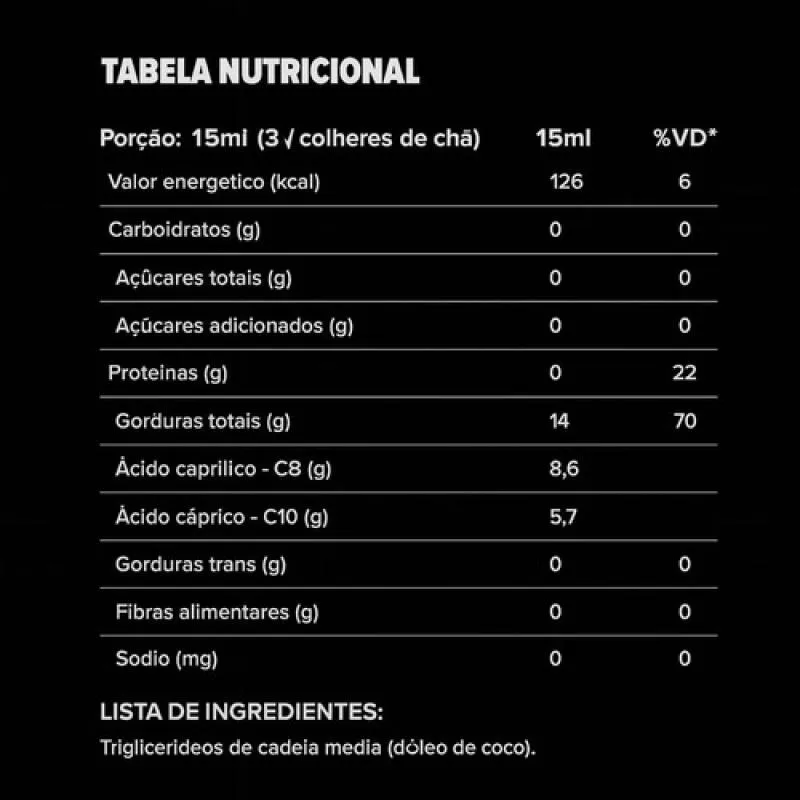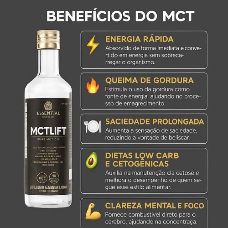 O Óleo de Coco MCT é uma fonte concentrada de triglicerídeos de cadeia média (TCM), extraídos do óleo de coco, que fornecem energia rápida e eficiente para o corpo e a mente. É ideal para quem busca mais disposição, performance nos treinos e apoio em dietas de controle de peso.