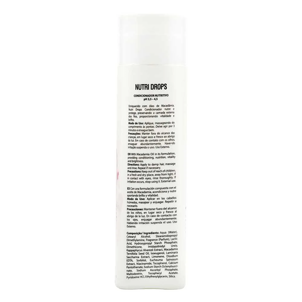 Enriquecido com óleo de Macadâmia, Nutri Drops condicionador nutre e protege, preservando a camada externa dos fios, proporcionando vitalidade e brilho.