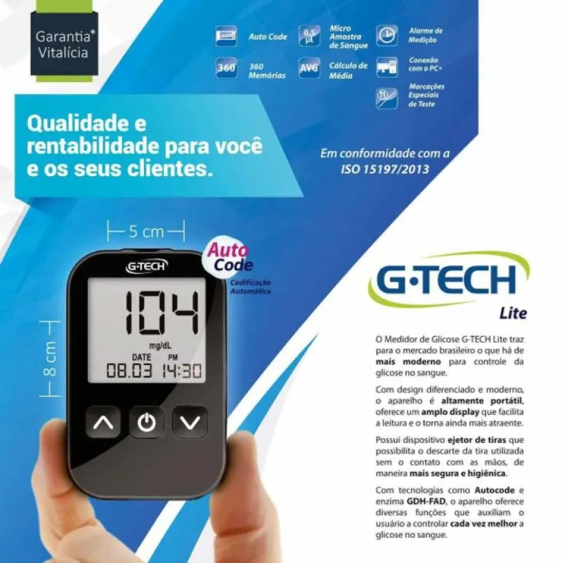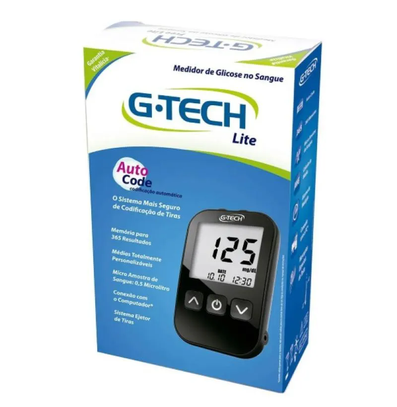 O Medidor de Glicose G-Tech Lite é um aparelho portátil projetado para monitoramento de glicemia, com um dispositivo especial que permite descartar as tiras sem contato direto com a pele. Possui um código em cada tira que garante resultados mais precisos e confiáveis, eliminando a possibilidade de resultados incorretos. Serve para medir a glicose de forma segura e precisa, permitindo que o usuário monitore seus níveis glicêmicos e compartilhe os resultados com o profissional de saúde responsável pelo tratamento.