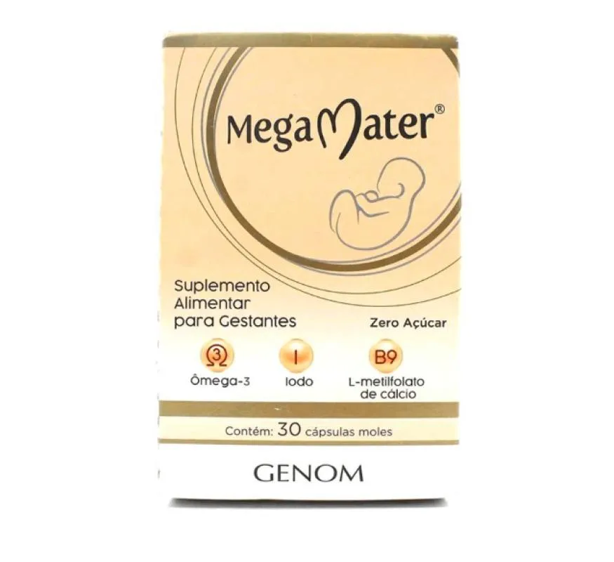 O Suplemento Mega Mater é rico em Ômega 3, Iodo, Ferro, Vitaminas e Ácido Fólico, sendo este último muito importante para auxiliar no desenvolvimento neurológico do bebê. Não contém açúcar e glúten.