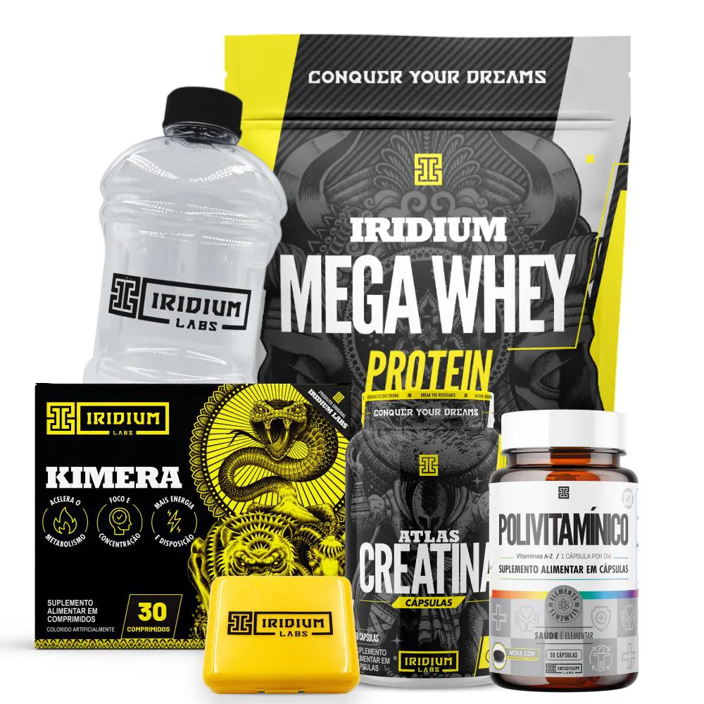 Mega Whey + Kimera Thermo 30 Comps + Atlas Creatina 60 Cáps + Polivitamínico 30 Caps + Galão Cristal 950Ml + Porta Cáps Morango