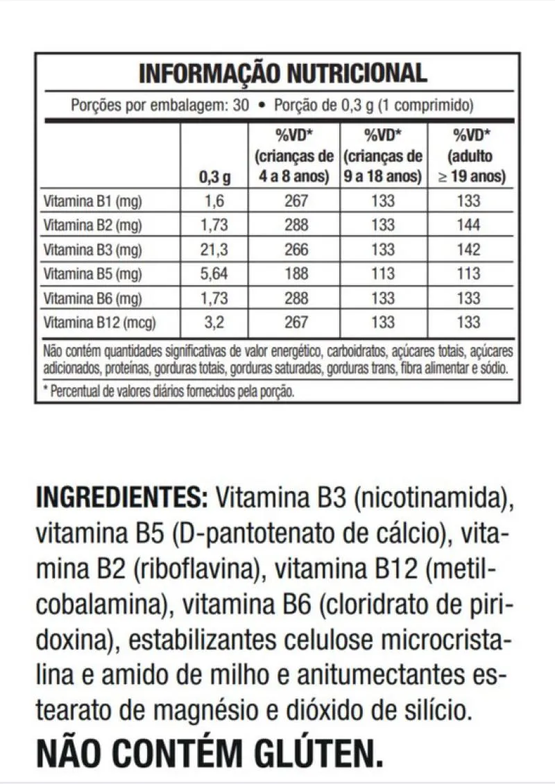 INGREDIENTES: vitamina B3 (nicotinamida), vitamina B5 (D-pantotenato de cálcio), vitamina B2 (riboflavina), vitamina B12 (metil-cobalamina), vitamina B6 (cloridrato de piri-doxina), estabilizantes celulose microcrista-lina e amido de milho e anitumectantes estearato de magnésio e dióxido de silício.