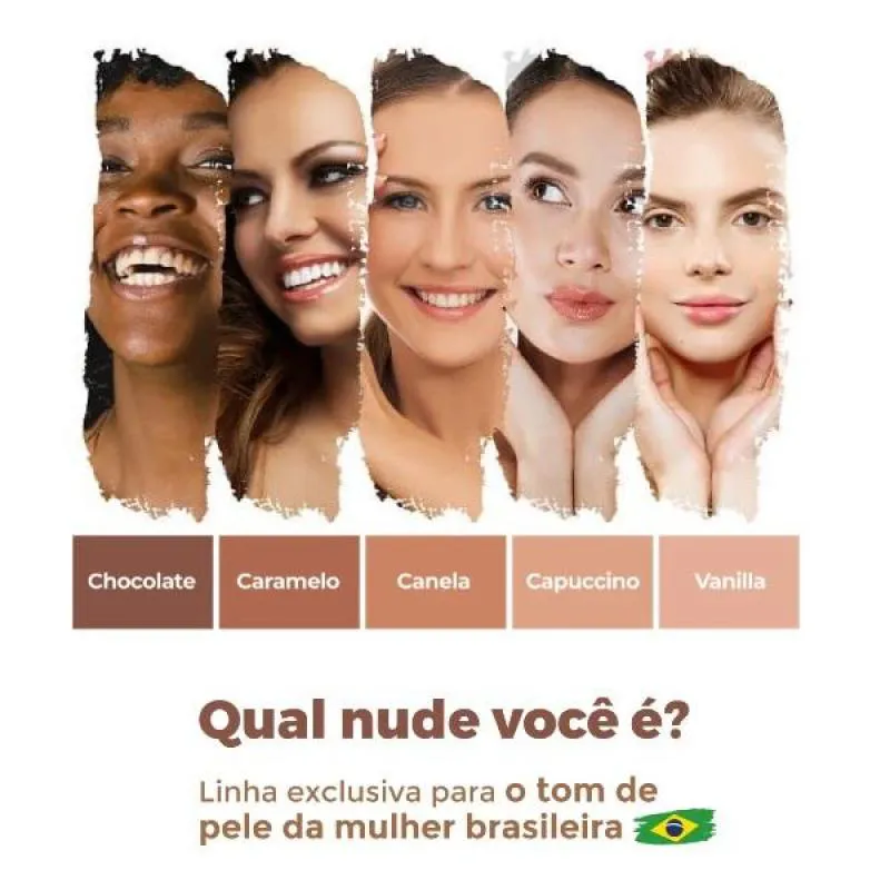 Depois de muita pesquisa com mais de 150 tons de pele, conseguimos combinar uma malha muito discreta e uma paleta de tons exclusiva do público feminino brasileiro.