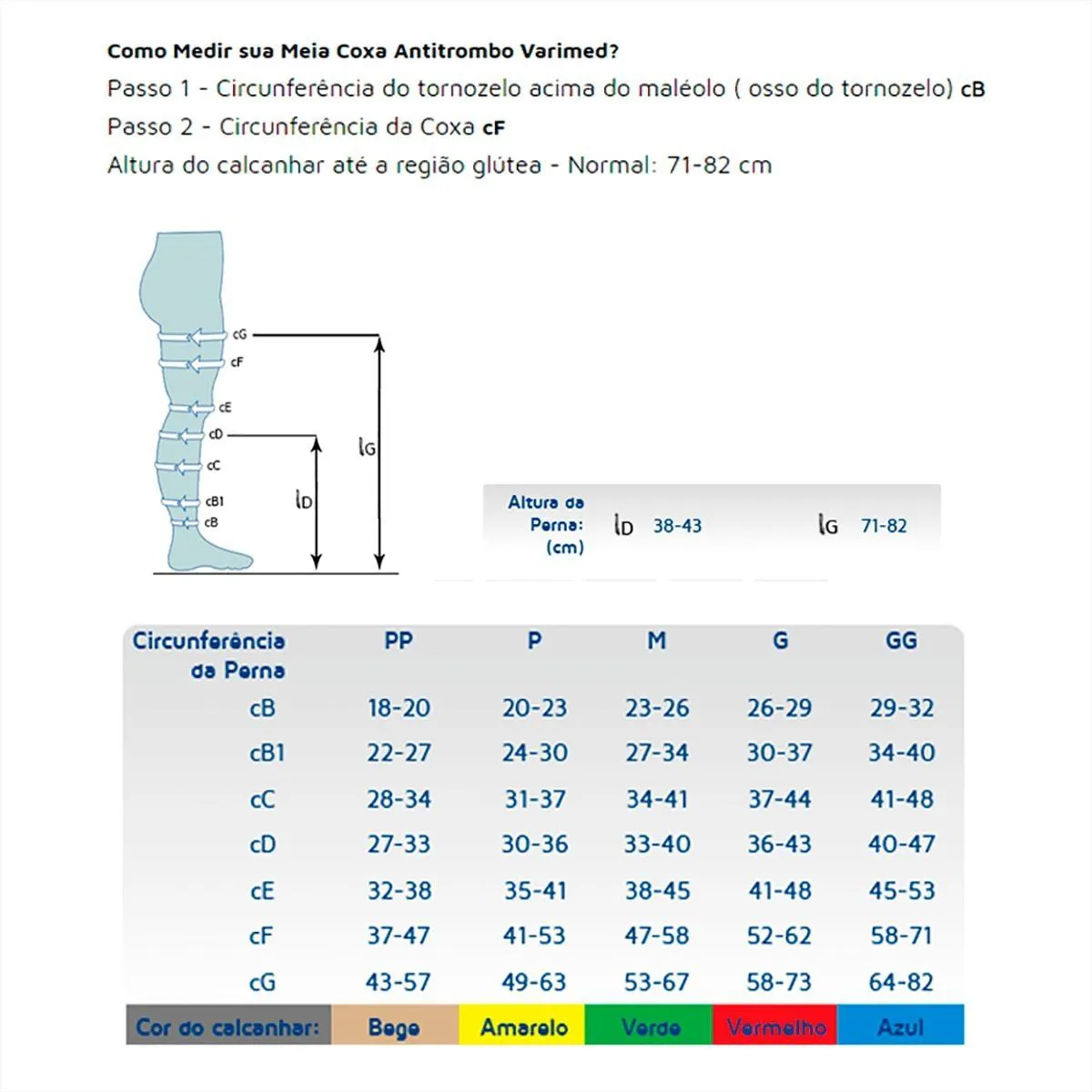 MEIA COMPRESSIVA VARIMED - ANTIEMBOLIA E ANTITROMBO (18mmHg) - 7/8 - COXA Produto original varimed, com nota fiscal Atenção! Caso nunca tenha utilizado, fazer a medida de acordo com as instruções para selecionar o tamanho corretamente! (Instruções na parte de fotos ) Não fazemos troca após embalagem violada! Descrição: As meias Varimed antiembolia e antitrombo aumentam a velocidade da circulação venosa do sangue. Contribuem igualmente para evitar a formação de coágulos que provocam trombose e embolias pulmonares. Indicações: . Imobilidade geral . Pessoas acamadas . Antes, durante e depois do parto . Prevenção de trombose e embolia pulmonar antes, durante e depois de cirurgias . Ortopédicas, traumatológicas, ginecológicas, bariátricas, plásticas, dentre outras Características: . Compressão: 18mmHg . Cor Branca Como Medir sua Meia Coxa Antitrombo Varimed? Passo 1 - Circunferência do tornozelo acima do maléolo (osso do tornozelo) cB Passo 2 - Circunferência da Coxa cF Altura do calcanhar até a região glútea - Normal: 71-82 cm Composição: 76% Poliamida / 24% Elastano. Ponteira: Aberta Contém 01 par de Meia Compressiva 7/8 Varimed Antitrombo e Anti Embolismo Cor Branca Registo Anvisa: 80153030043