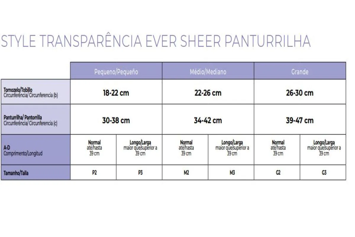 A Meia Elástica EVER SHEER Panturrilha Compressão 20-30 mmHg longaA linha feminina Style Transparência Ever Sheer foi desenvolvida especialmente para o público feminino, com uma moderna tecnologia que proporciona um aspecto natural. As meias são fáceis de calçar e oferecem conforto e maciez para as pernas. Eficazes para o tratamento das doenças venosas e linfáticas com manifestações leves e moderadas.