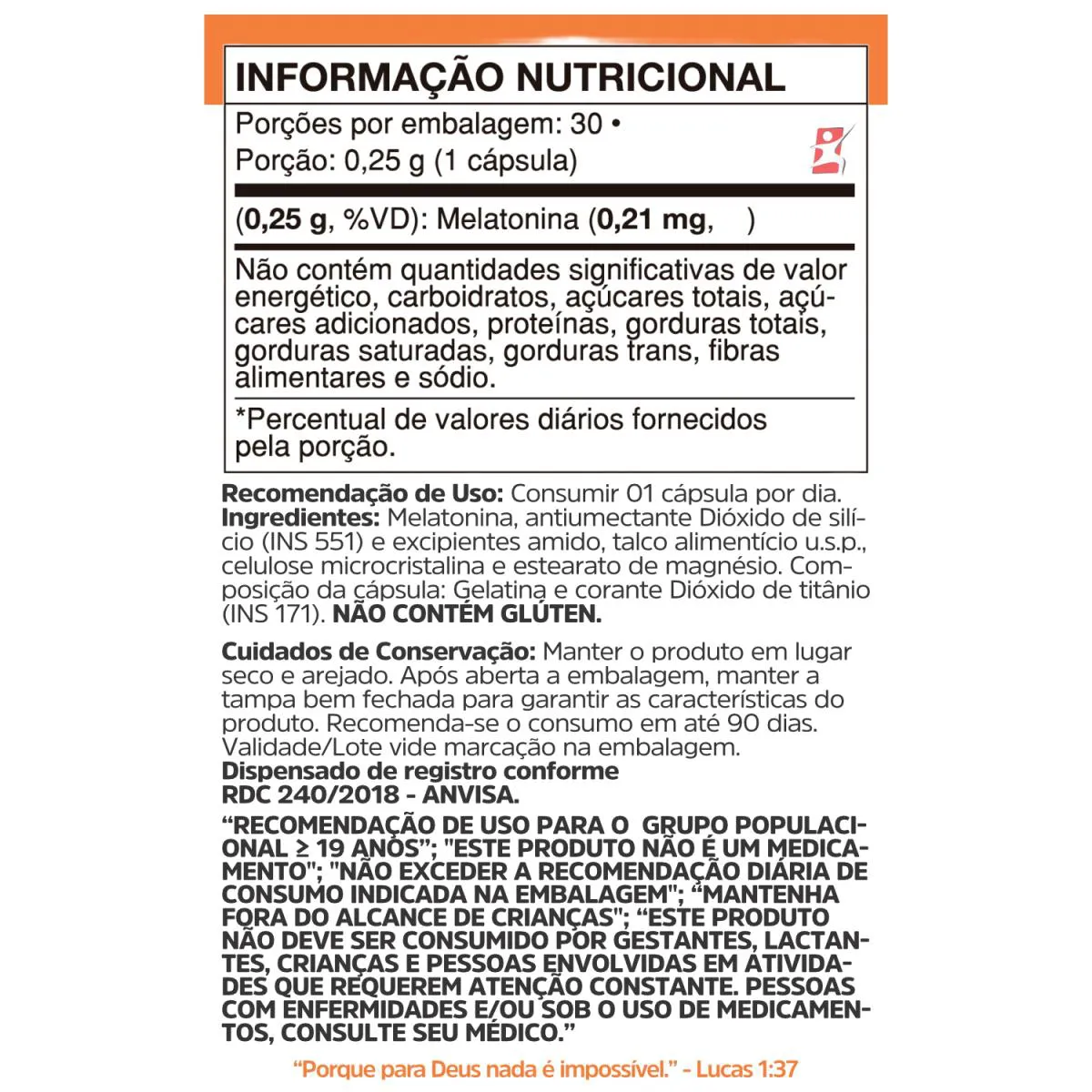 MELATONINA 0,21MG 1 AO DIA 30 CAPSULAS - VIDNUTRIDESCRIÇÃO   Suplemento alimentar de melatonina em cápsulas.      SUGESTÃO DE USO   Consumir 01 cápsula por dia.     TABELA NUTRICIONAL - COMPOSIÇÃO - RECOMENDAÇÕES & CUIDADOS   Anexo nas imagens do anúncio.     REGISTRO ANVISA   Dispensado de registro conforme RDC 240/2018 Anvisa.