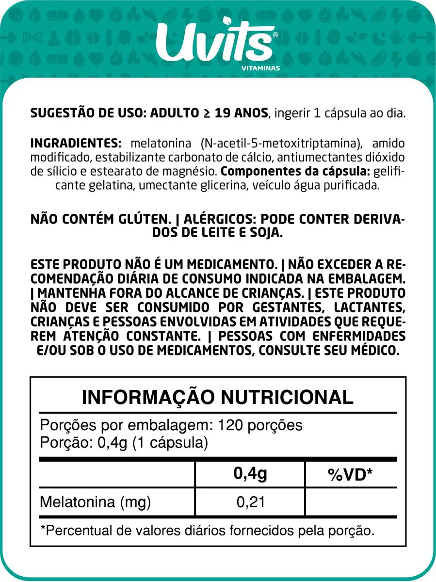 O sono é fundamental para a saúde e para o bem-estar. Durante o descanso noturno o sistema imunológico é restaurado, liberando a secreção de hormônios, como a Melatonina, que desempenha importantes funções para o organismo. Indicado para uso noturno. Composição: ✔ Melatonina (N-acetil-5-metoxitriptamina) ✔ Amido modificado ✔ Estabilizante carbonato de cálcio ✔ Antiumectantes dióxido de sílicio e estearato de magnésio