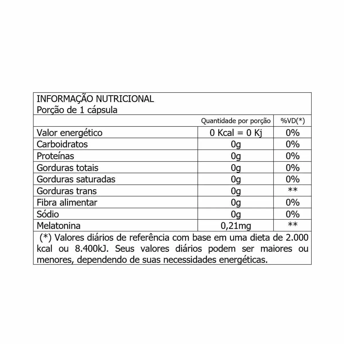 Melatonina, agente de massa celulose microcristalina e antiumectante dióxido de silício coloidal. Cápsula: Gelatina e umectante glicerina. NÃO CONTÉM GLÚTEN. ...