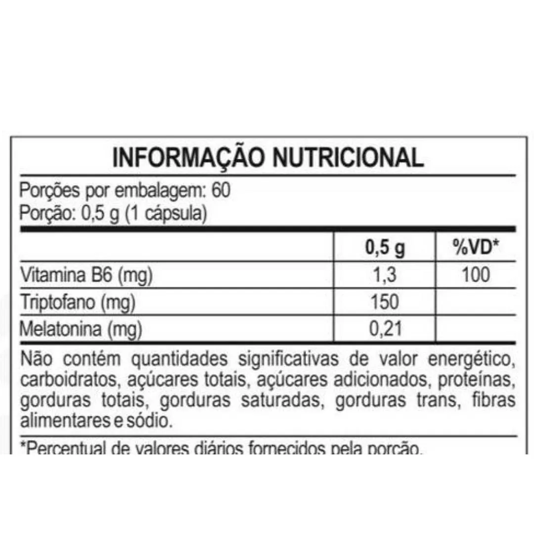 INGREDIENTES: L-triptofano, cloridrato de piridoxina e melatonina. Silicato de magnésio e antiumectante dióxido de silício. Composição da cápsula: gelificante gelatina e corante dióxido de titânio. RECOMENDAÇÕES DE USO: Ingerir 1 (uma) cápsula á noite 1h antes de dormir. Produto indicado para o grupo populacional ≥ 19 anos. GRUPO POPULACIONAL> ADULTOS 19 ANOS PREUCAÇÕES E ADVERTÊNCIAS: MANTER FORA DO ALCANCE DE CRIANÇAS. CONSUMIR ESTE PRODUTO CONFORME A RECOMENDAÇÃO DE INGESTÃO DIÁRIA CONSTANTE NA EMBALAGEM. ESTE PRODUTO NÃO É UM MEDICAMENTO. ESTE PRODUTO NÃO DEVE SER CONSUMIDO POR GESTANTES, LACTANTES E CRIANÇAS.