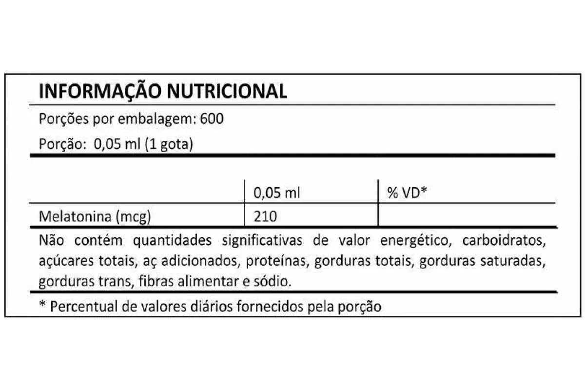 Água Purificada, Glicerina Vegetal, Melatonina, Ácido Cítrico, Acessulfame de Potássio, Sorbato de Potássio, Aroma idêntico ao natural de Maracujá, glicosídeos de steviol.