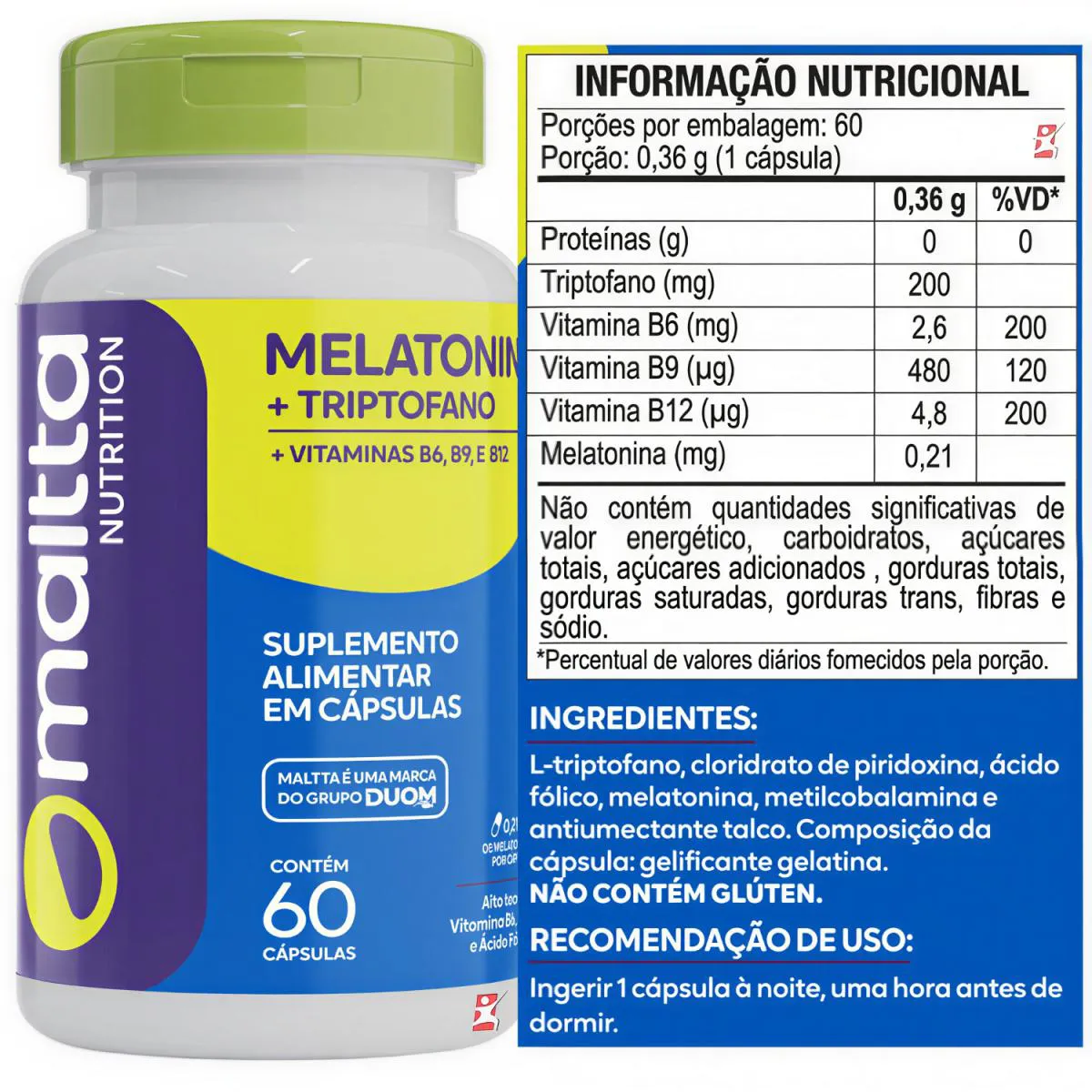 MELATONINA + triptofano + VIT B6 + VIT B9 + VIT B12 - DUOM: MALLTA NUTRITION   DESCRIÇÃO A melatonina é um hormônio produzido naturalmente pelo organismo, que possui como principal função regular o ciclo circadiano, fazendo com que funcione normalmente. Além disso, a melatonina promove o bom funcionamento do organismo e atua como antioxidante. Este hormônio é produzido pela glândula pineal, que só é ativada quando não há estímulos luminosos, ou seja, a produção de melatonina só ocorre à noite, induzindo o sono. Por isso, na hora de dormir, é importante evitar a luminosidade, estímulos sonoros ou aromáticos que possam acelerar o metabolismo e diminuir a produção de melatonina. Geralmente, a produção de melatonina diminui com o envelhecimento e é, por isso, que os distúrbios de sono são mais frequentes em adultos ou idosos. Apesar de ser naturalmente produzido pelo organismo, é possível também obter a melatonina através de suplementos.   O triptofano, também conhecido como L triptofano, é um aminoácido essencial, não produzido pelo organismo e que deve ser obtido pela alimentação. Ele participa do crescimento normal e da síntese proteica, além de regular diversos mecanismos fisiológicos, sendo encontrado na corrente sanguínea ou em proteínas transportadoras. Dessa forma, o triptofano tem influências indiretas sobre o comportamento alimentar, fadiga e sono, bem como o estímulo da insulina e do hormônio do crescimento.     BENEFÍCIOS - 0,21 de MELATONINA por cápsula; - 200mg de L-Triptofano por cápsula; - Auxilia a promover o bom funcionamento do organismo; - Auxilia a melhorar o ciclo e a qualidade do sono; - Auxilia a melhorar a depressão sazonal; - Auxilia a reduzir a acidez do estômgado; - Age com antioxidante; - Emagrecimento; - Estimula o a liberação do GH, o hormônio do crescimento; - Ajuda a controlar os sintomas da TPM, estabilizando as oscilações de humor; - Controla o apetite, auxiliando no emagrecimento e reduz a vontade de comer carboidratos; - Reduz os sintomas associados ao estresse e à ansiedade, uma vez que pode diminuir a secreção de cortisol, o hormônio do estresse.   SUGESTÃO DE USO Ingerir 1 cápsula de noite, uma hora antes de dormir.   TABELA NUTRICIONAL Em anexo nas imagens do anúncio.   COMPOSIÇÃO L-Triptofano, cloridrato de piridoxina, ácido fólico, melatonina, metilcobalamina e antiumectante talco. Composição da cápsula: gelificante gelatina. NÃO CONTÉM GLÚTEN.   RECOMENDAÇÕES Melatonina + Triptofano + Vitaminas B6, B9 e B12. SUPLEMENTO ALIMENTAR EM CÁPSULAS. Contém 60 cápsulas. Alto teor de Vitaminas B6, B12 e Ácido Fólico. 0,21mg de Melatonina por cápsulas. PRODUTO INDICADO A PESSOAS ACIMA DE 19 ANOS. ESTE PRODUTO NÃO DEVE SER CONSUMIDO POR GESTANTE, LACTANTE E CRIANÇAS. ESTE PRODUTO NÃO É UM MEDICAMENTO. NÃO EXCEDER A RECOMENDAÇÃO DIÁRIA DE CONSUMO INDICADO NA EMBALAGEM. MANTENHA FORA DO ALCANCE DE CRIANÇAS.   DADOS TÉCNICOS Marca – Duom: MALTTA NUTRITION. Conteúdo líquido total – 60 cápsulas. Rendimento líquido total – 60 doses/porções. Peso líquido total – 21,6g. Peso produto + embalagem (aproximado) – 150g. Código de barras (EAN) – 7898665752043. Registro ANVISA – Produto autorizado para comercialização através da RDC nº27/2010 e RDC 240/2018. Dimensões do produto – altura 12 cm; largura 7 cm; comprimento 7 cm. Dimensões da embalagem padrão – altura 7 cm; largura 10 cm; comprimento 15cm.   ITENS DO ANÚNCIO: 1 Unidade do produto: MELATONINA + TRIPTOFANO + VIT B6 + VIT B9 + VIT B12 - DUOM: MALLTA NUTRITION. TOTAL: 60 cápsulas POR FRASCO.