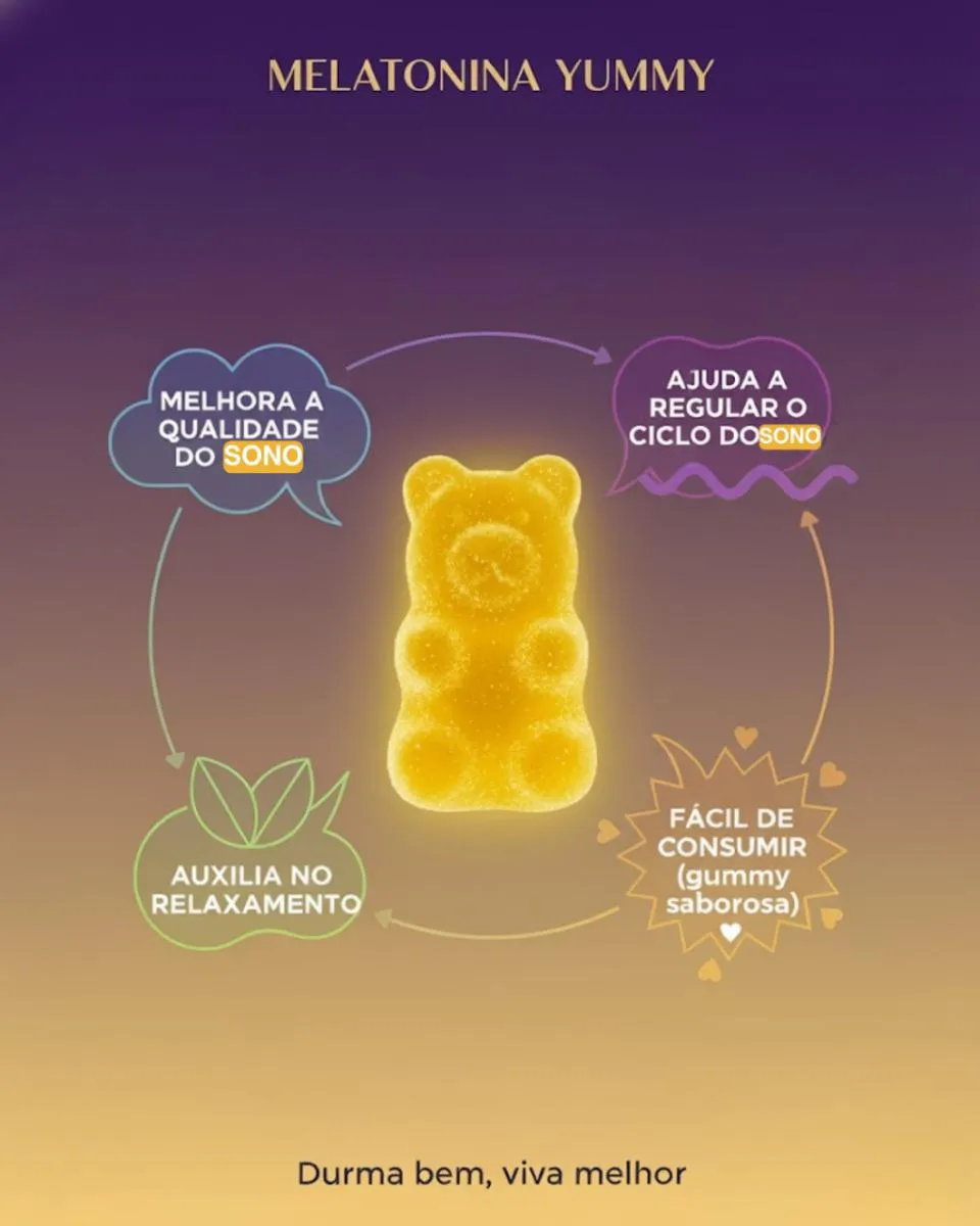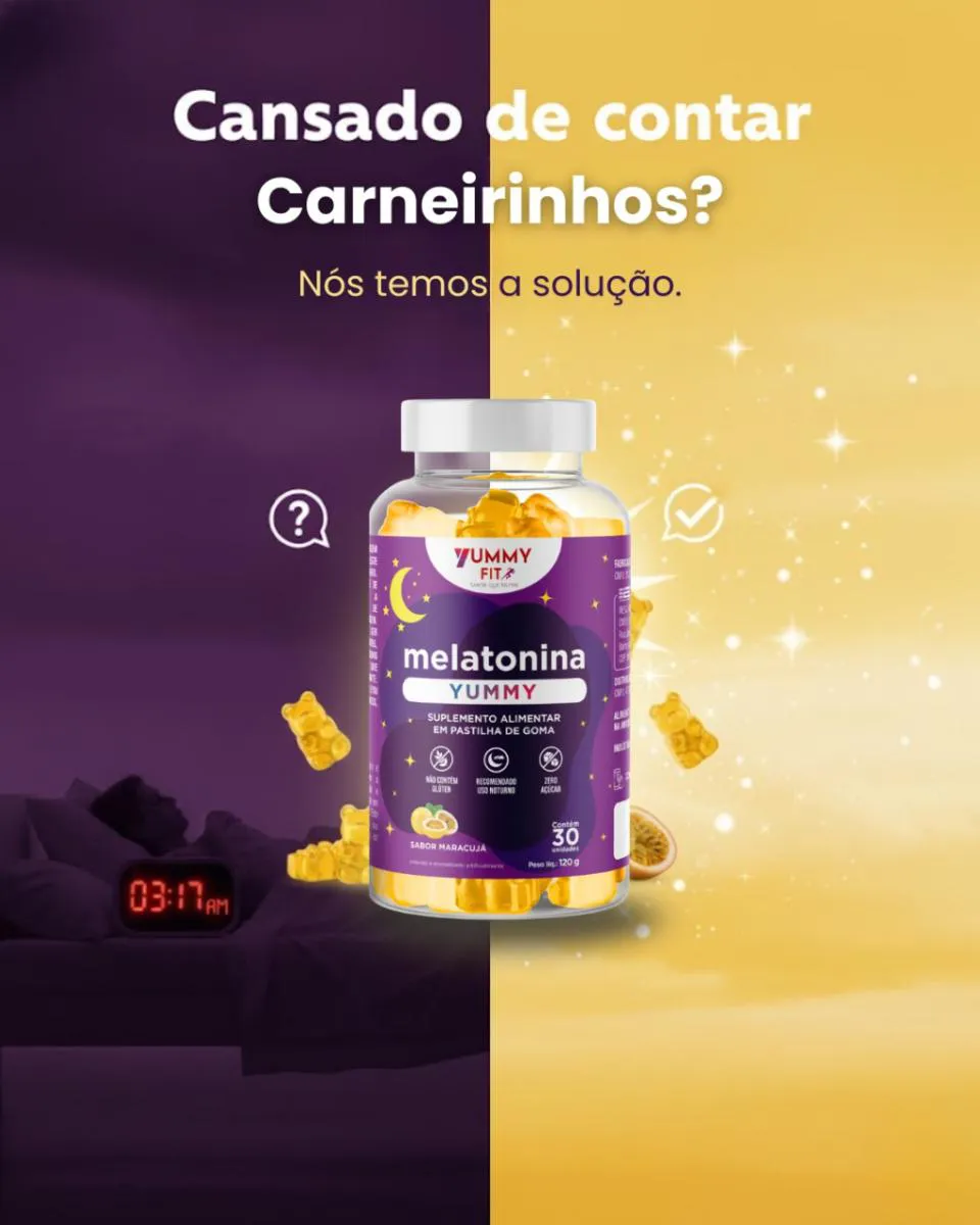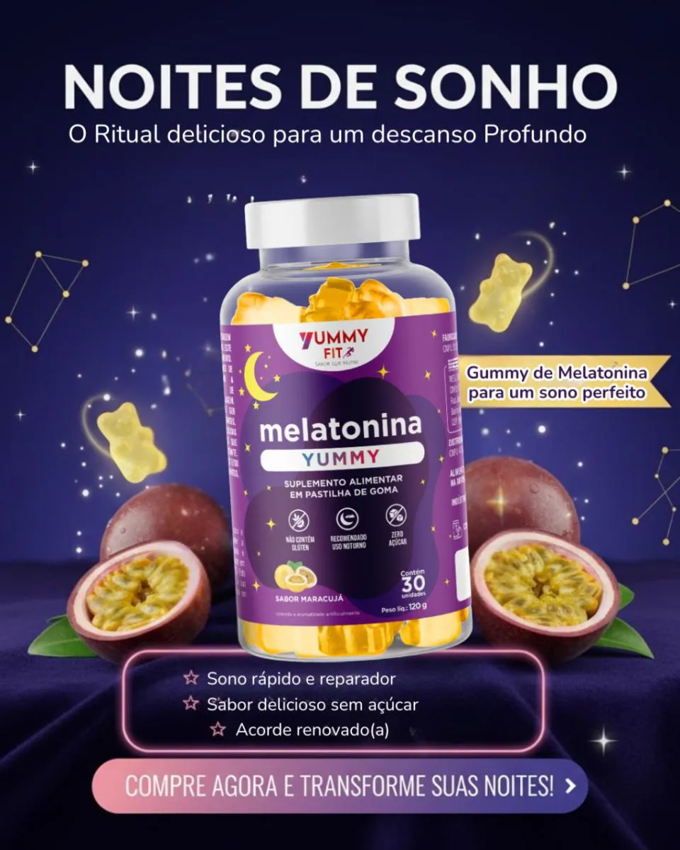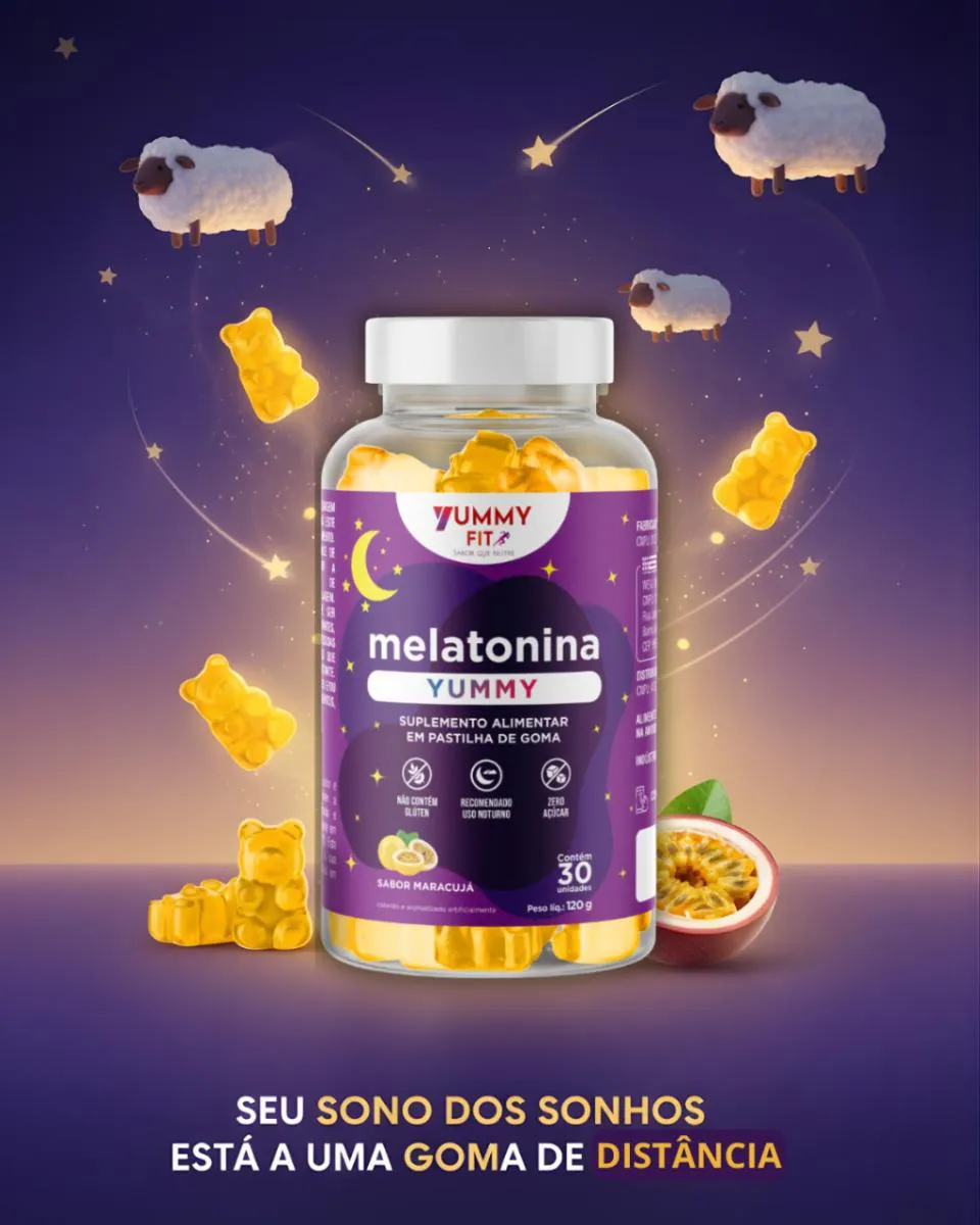 Ei, guerreira do feed infinito... Você sabe aquela sensação de rolar o TikTok até as 3 da manhã, olhos ardendo, mente a mil, e no dia seguinte? Um caos total: cansaço que não passa com café, pele opaca, humor no chão e zero energia pra arrasar no rolê. ? Eu sei, porque eu era você! Noites viradas virando panquecas, acordando como zumbi e jurando "amanhã eu durmo cedo" (spoiler: nunca rolava). Mas e se eu te disser que existe um hack simples, delicioso e cientificamente comprovado pra resetar seu sono e acordar renovada, radiante e pronta pra conquistar o mundo? Apresento a Melatonina Yummy Fit em Gummies de Maracujá – não é só um suplemento, é o seu novo BFF noturno! ?? Feito pra quem ama o gostoso sem culpa, essa belezinha transforma o ritual de dormir em uma festa tropical. Imagina: um ursinho amarelinho que derrete na boca como um docinho fit, com sabor de maracujá que te transporta pra uma praia deserta... e bum! Sono profundo, sem remorso. Por Que Isso Não É Mais Um Suplemento Chato? Aqui Vão os Fatos Que Vão Te Convidar Pra Essa Revolução do Sono: ? Ciência ao Seu Lado: A melatonina é o hormônio natural que seu corpo implora pra regular o ciclo sono-vigília. Estudos da Harvard mostram que doses certas (como as nossas, de 1mg por goma) reduzem o tempo pra pegar no sono em até 50% e melhoram a qualidade do descanso em 30%. Nada de grogue matinal – só energia pura! ? Ingredientes Puros e Sem Culpa: 100% natural, sem glúten, sem lactose, zero açúcar adicionado (adoçado com stevia pra manter o fit). Cada goma é uma explosão de maracujá com extratos botânicos calmantes. Livre de corantes artificiais – porque você merece o melhor, sem toxinas escondidas. ? Prático Como Seu Lifestyle: Frasco elegante com 30 unidades (um mês inteiro de noites perfeitas), peso líquido de 120g. Leve na bolsa, no criado-mudo ou no nécessaire de viagem. Uma goma 30 minutos antes de deitar – simples assim! Os Benefícios Que Vão Mudar Sua Vida (E Seu Insta Stories):- Sono Reparador Instantâneo: Usuárias relatam cair no sono em 15 minutos e acordar com aquela glow up natural – pele mais luminosa, olheiras sumidas! ✨