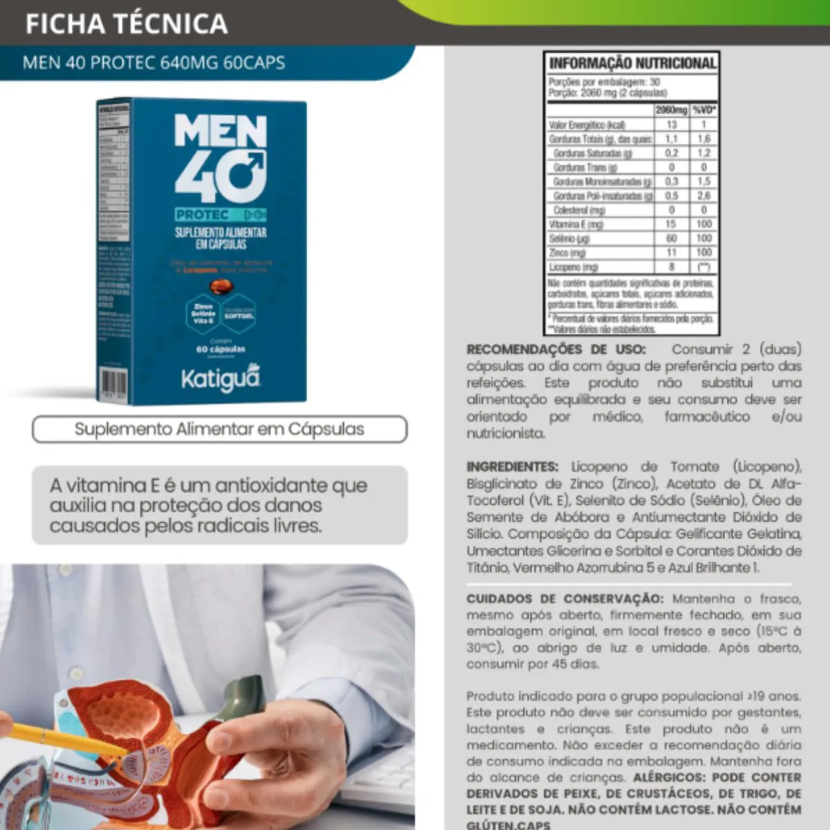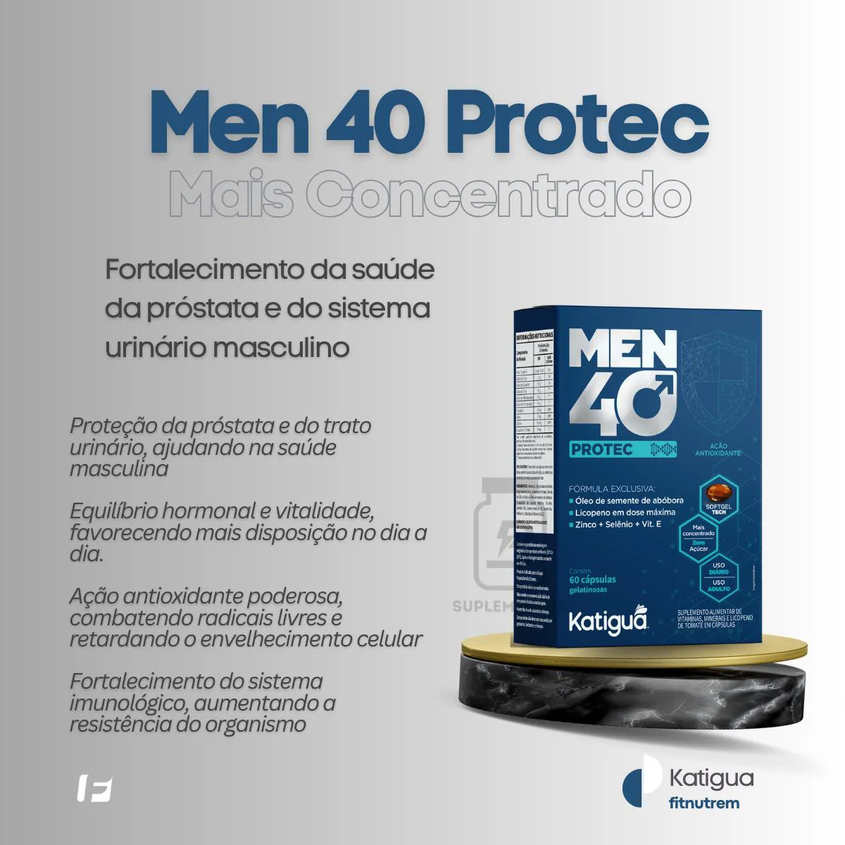 O Men 40 Protec Katiguá é um suplemento alimentar formulado com nutrientes e extratos naturais, ideal para homens a partir dos 40 anos que buscam equilíbrio e bem-estar.Benefícios:
