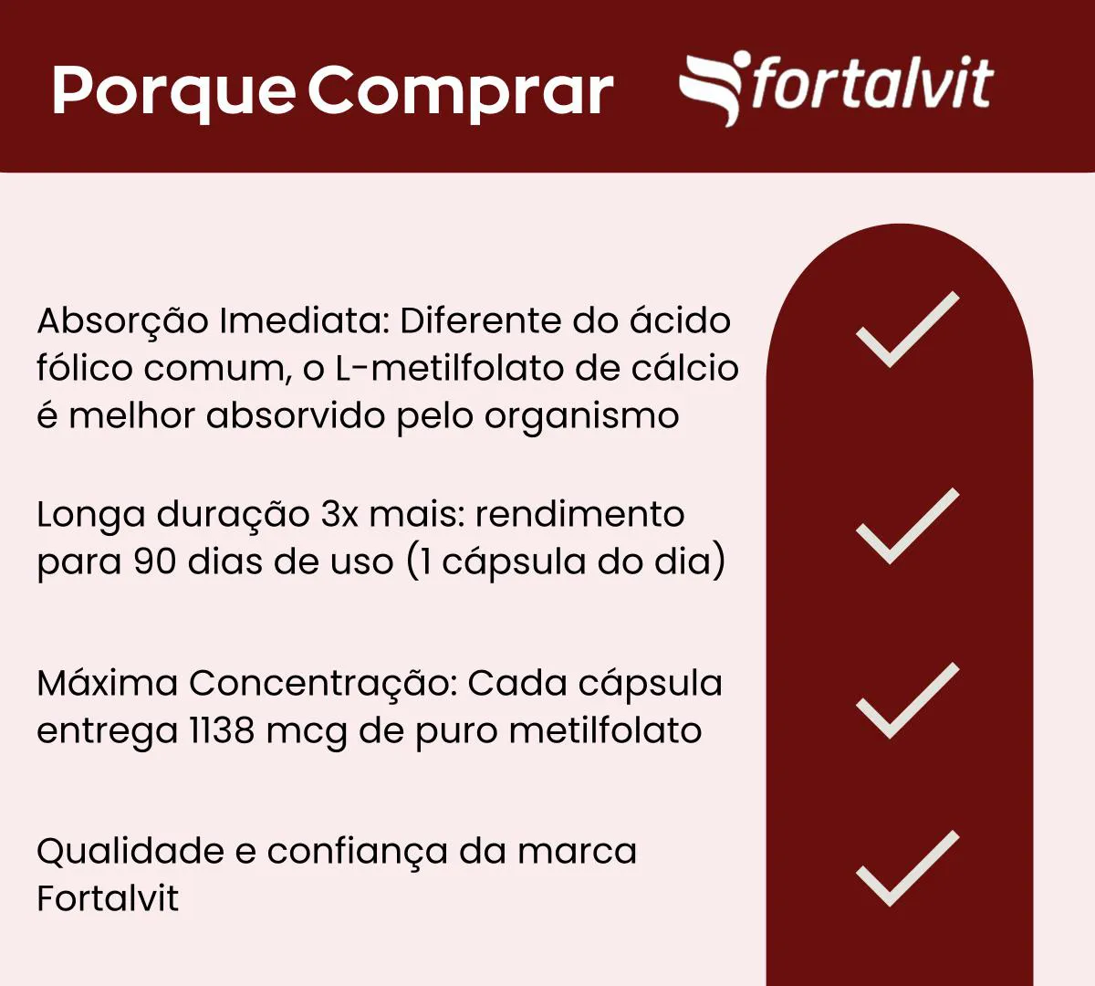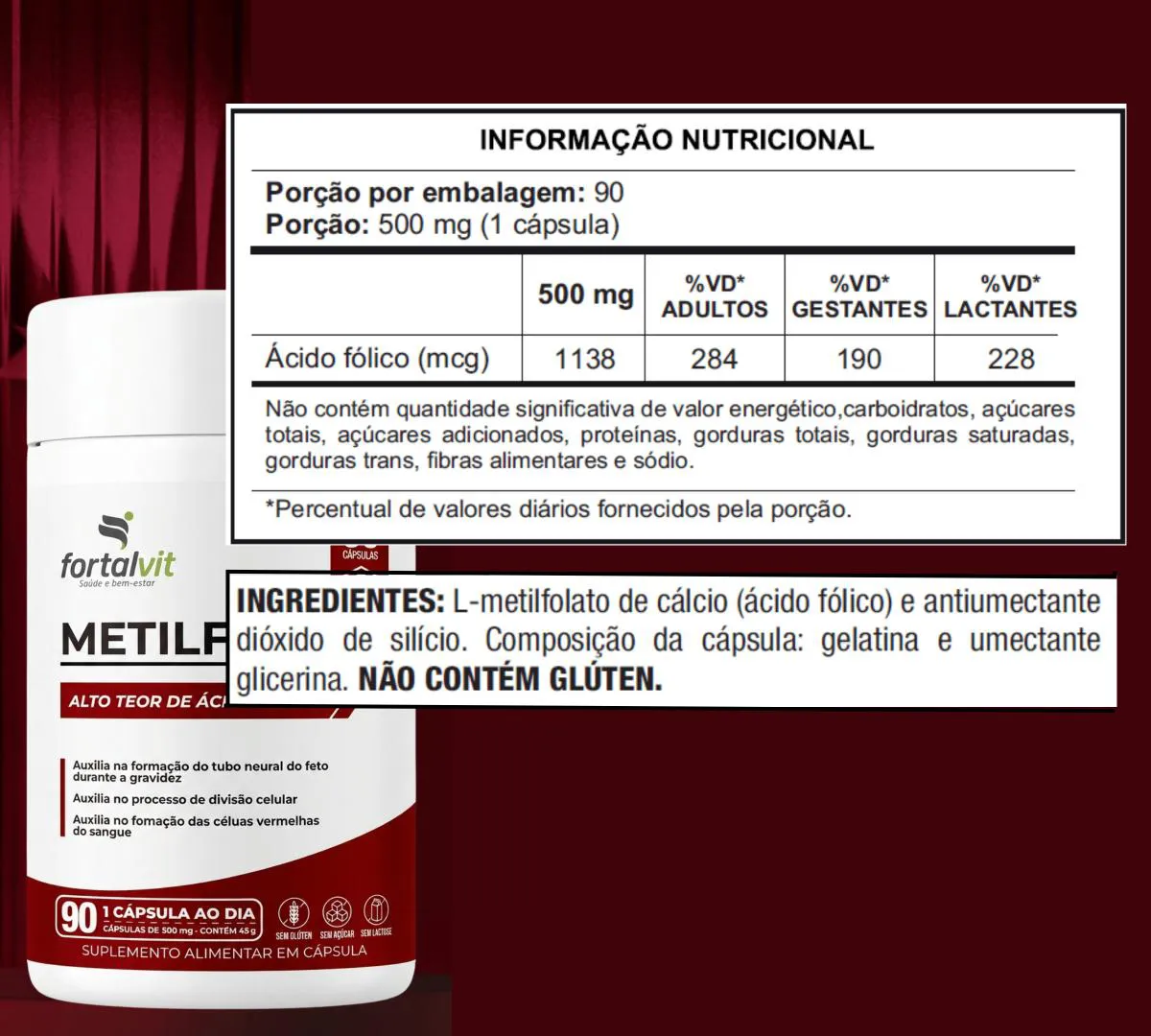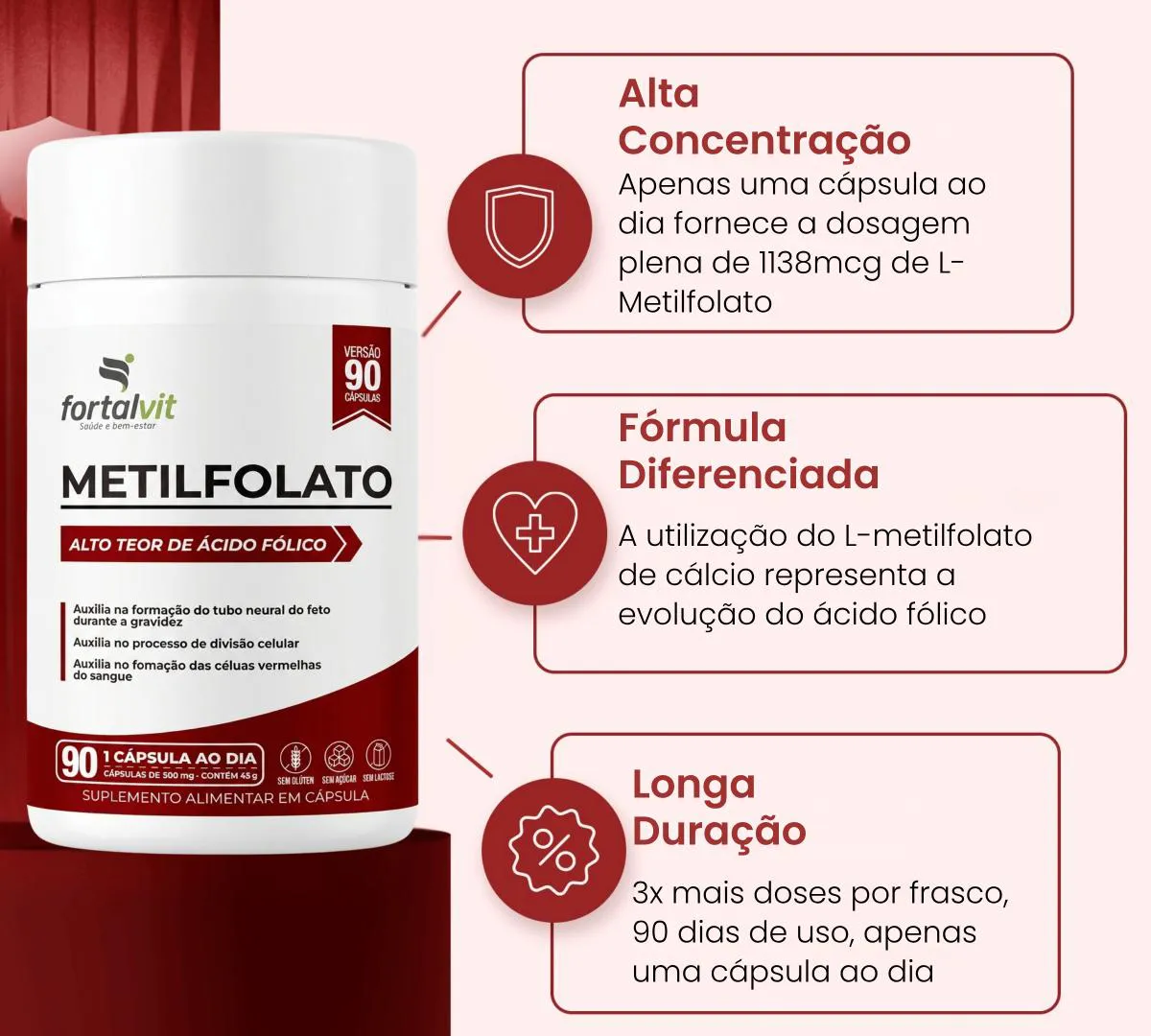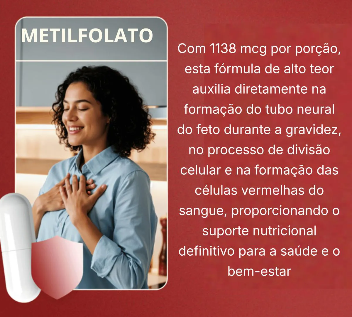 - ALTA CONCENTRAÇÃO: Cada cápsula fornece 1138 mcg de Ácido Fólico (L-metilfolato de cálcio) , garantindo um alto teor desta vitamina essencial para o organismo