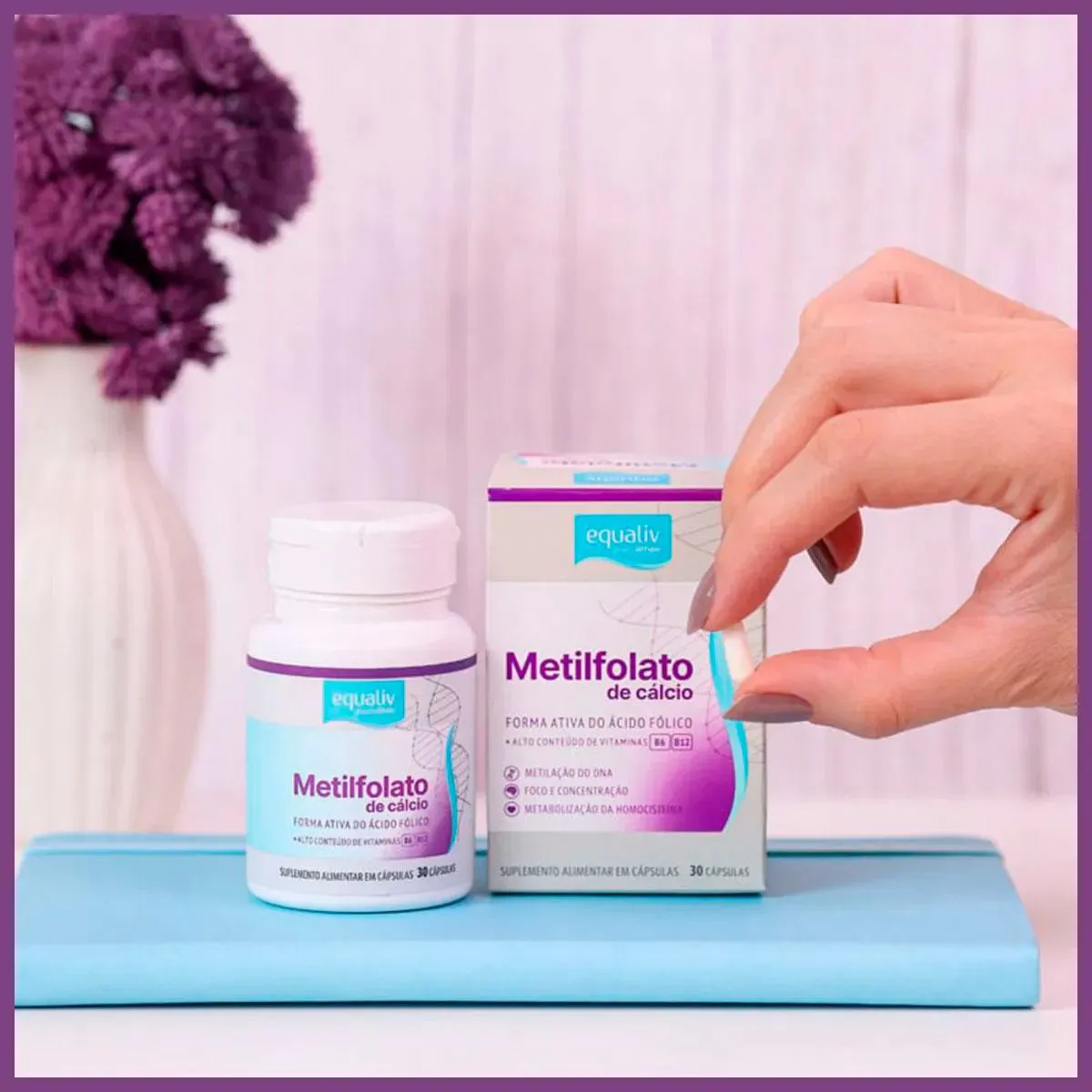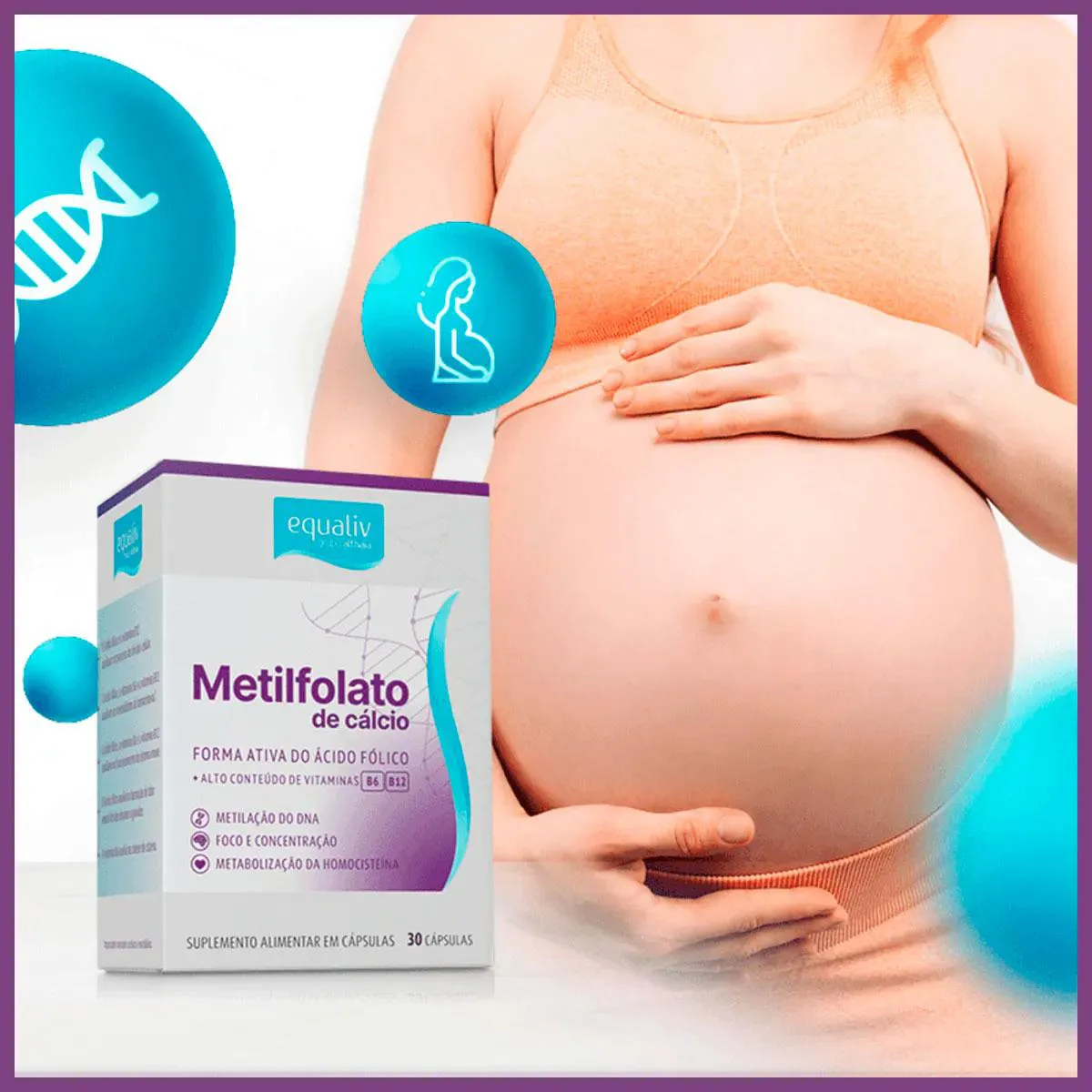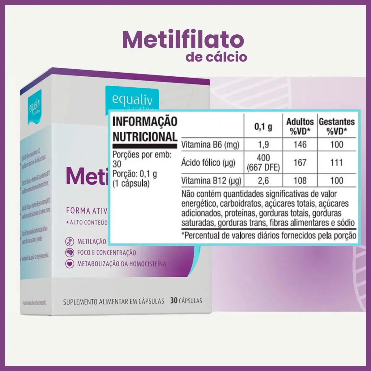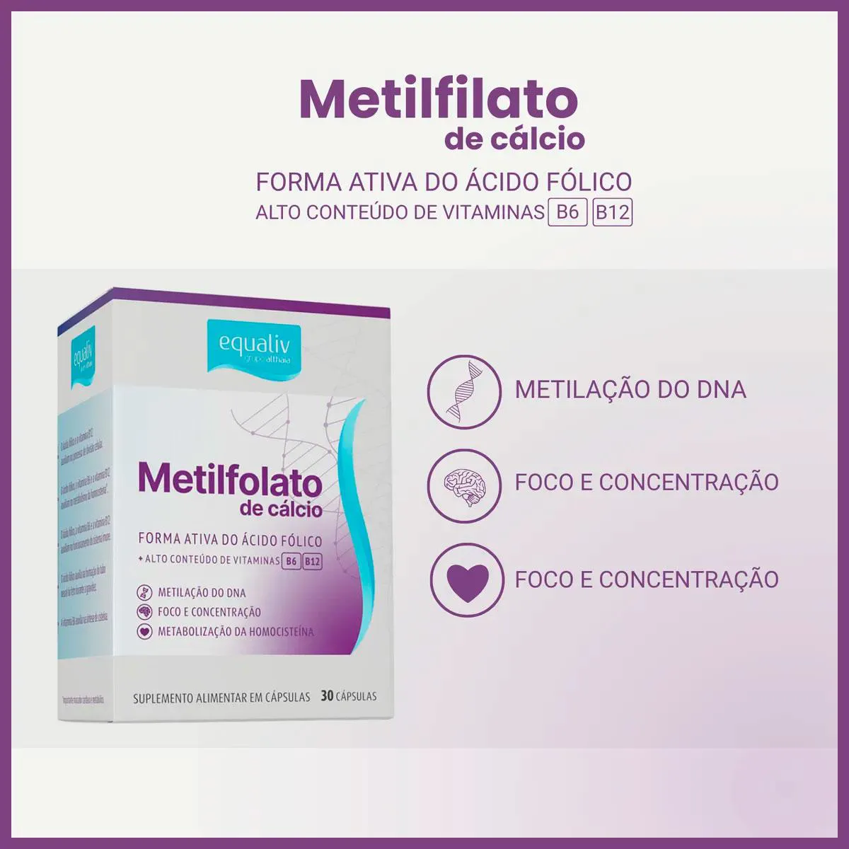 "Equaliv Metilfolato é um suplemento alimentar composto pela fórmula ativa do ácido fólico (L-Metilfolato de Cálcio), vitaminas B6 e B12. Quando ingerimos o ácido fólico, o mesmo precisa ser convertido na sua forma ativa. A suplementação com Equaliv Metilfolato dispensa metabolização e disponibiliza prontamente ao nosso organismo a forma ativa, aumentando a taxa de absorção em 26%, sendo recomendado seu uso três meses antes de a mulher engravidar e continuar no primeiro trimestre da gestação, visando a saúde do bebê. Equaliv Metilfolato possui uma formulação completa ainda com as vitaminas B6 e B12 para melhora do sistema imune; melhor metabolização da homocisteína, proteínas, carboidratos e gorduras; síntese de cisteína; e metabolismo energético. Consumir 1 (uma) cápsula ao dia. *USO ADULTO E GESTANTES. Contém 30 cápsulas. Ingredientes: Cloridrato de piridoxina, L-metilfolato de cálcio, cianocobalamina, (estabilizante) celulose microcristalina, (lubrificante) talco, (antiumectante) dióxido de silício e cápsula vegetal. “NÃO CONTÉM GLÚTEN.” Consumir 1 cápsula ao dia ou conforme orientação profissional. *ADULTOS E GESTANTES. NÃO EXCEDER A RECOMENDAÇÃO DIÁRIA DE CONSUMO INDICADA NA EMBALAGEM. ESTE PRODUTO NÃO É UM MEDICAMENTO. MANTENHA FORA DO ALCANCE DE CRIANÇAS." CUIDADOS DE CONSERVAÇÃO: O produto deve ser mantido em sua embalagem original, em local seco e fresco, ao abrigo da luz e umidade. Esta embalagem foi selada para sua proteção. Não utilize o produto em caso de violação." Aviso legal • Idade mínima recomendada: 19 anos. • Consumir junto com alimentos para facilitar sua assimilação. • Este produto é um suplemento dietético, não um medicamento. Suplementa dietas insuficientes. Consulte o seu médico e/ou farmacêutico.