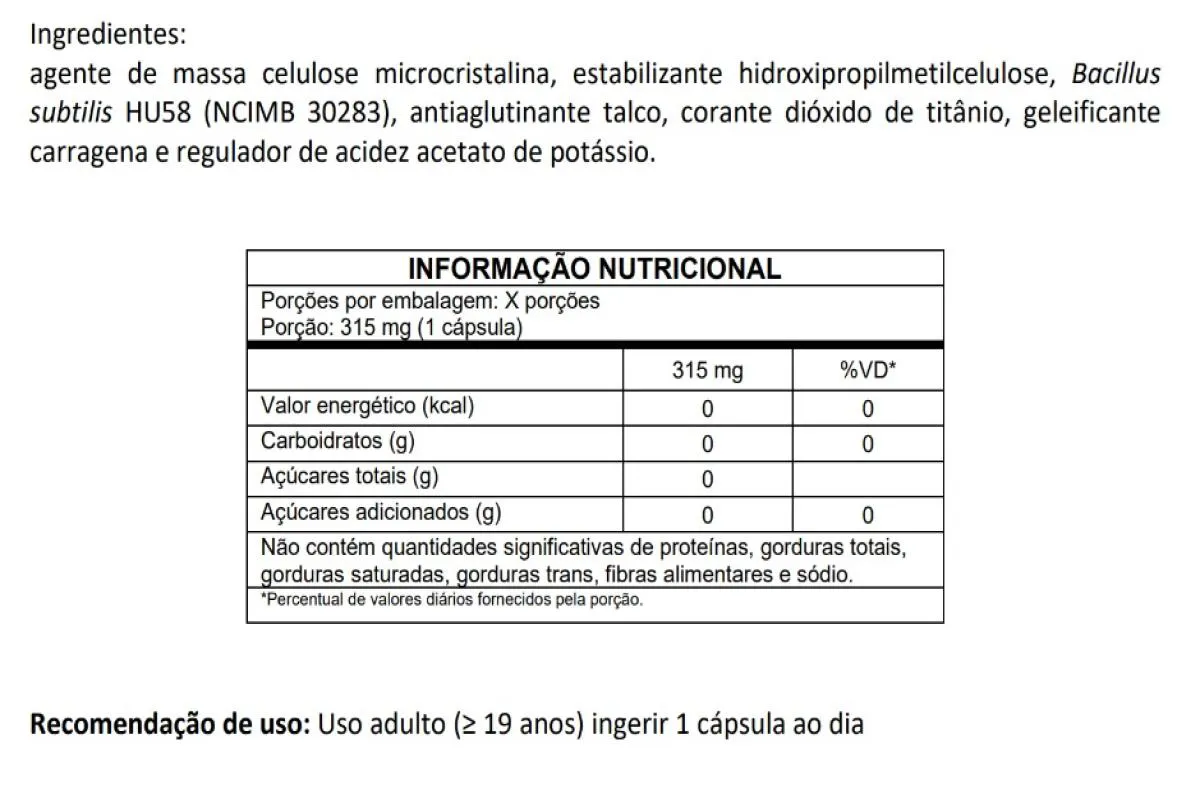 Sua fórmula contém a cepa Bacillus subtilis HU58, um probiótico em forma de esporo. Isso significa que ele é altamente resistente ao pH ácido do estômago, não sendo destruído pelo ácido gástrico. Dessa forma, o probiótico chega íntegro ao intestino, onde realiza o processo de esporulação, ativando-se no local correto para agir de forma eficaz.