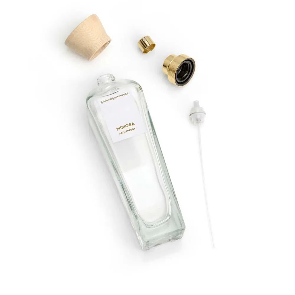 Seu frasco com design único e atemporal reforça o principal pilar da coleção de fragrâncias de Adolfo Dominguez: a sustentabilidade. Combinando o respeito à natureza com a sofisticação, é composto por vidro 36% reciclado, 100% reciclável e reutilizável por toda a vida graças ao borrifador rosqueável.