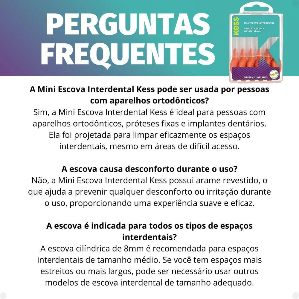 Mini Escova Interdental A Mini Escova Interdental Cilíndrica Grossa é a melhor aliada em cuidados orais. Projetada para remover eficazmente resíduos alimentares dos espaços interdentais, esta escova cilíndrica de 8 mm garante uma limpeza completa, inclusive entre próteses fixas, aparelhos ortodônticos e implantes dentários. Com um arame revestido que previne incômodos, essa escova oferece uma experiência de uso suave e eficiente.