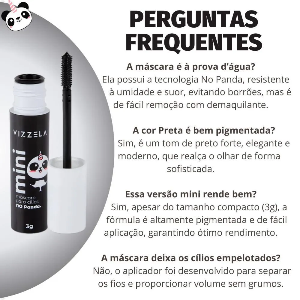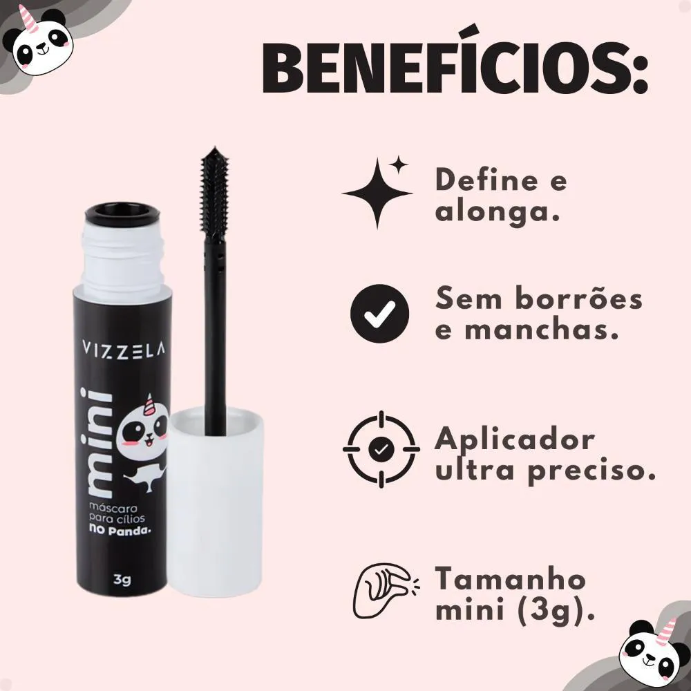 maquiagem completa, proporcionando um acabamento impecável que resiste ao longo do dia. Experimente a praticidade e o poder de um olhar transformador com a Mini Máscara de Cílios Vizzela No Panda Preta 3g.