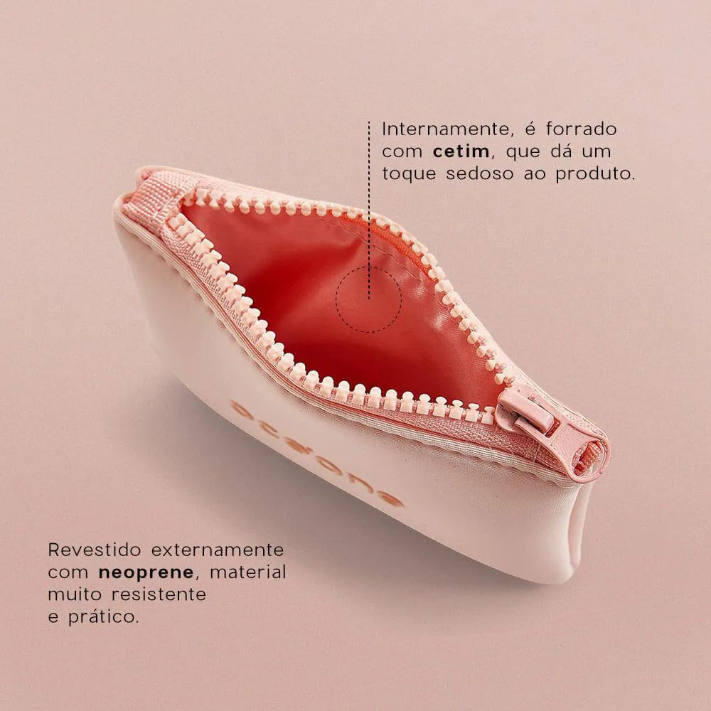 externamente, o Revestimento em Neoprene Rosa Claro É Moderno e Muito Prático, Porque Além de Ser Impermeável, É Muito Fácil de Limpar. Isso sem Falar Que a Cor É Super Elegante! Já Por Dentro, o Organizador Possui Forro de Cetim Rosa Um Pouco Mais Escuro, Criando Um Contraste Bonito com a Cor Externa. o Fechamento É Feito com Zíper Rosa Super Resistente, Que Garante Que o Não Vai Abrir Na Sua Bolsa. o Toque Final de Charme Deste Produto Fica Por Conta do Logo Océane em Alto Relevo Emborrachado, Uma Referência Discreta à Sua Atitude Na Hora de Cuidar Dos Seus Itens de beleza.