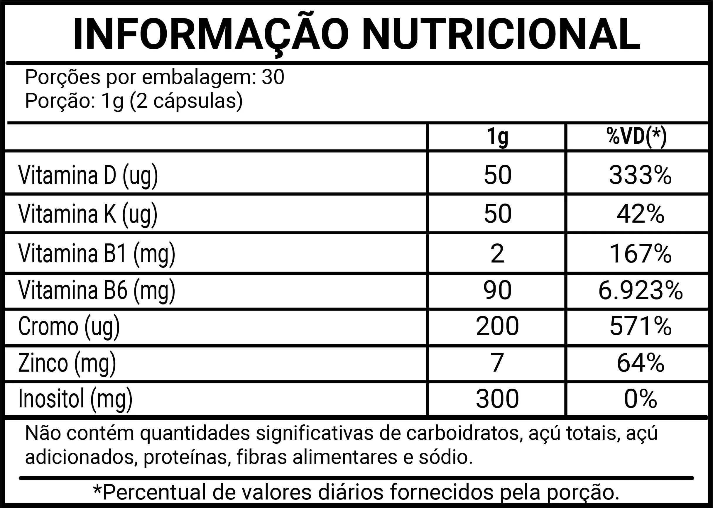 Mio-inositol, cloridrato de piridoxina (vitamina B6), bisglicinato de zinco, menaquinona-7 (vitamina K2), cloridrato de tiamina (vitamina B1), picolinato de cromo, colecalciferol (vitamina D3), silicato de magnésio (INS 553i), dióxido de silício (INS 551).