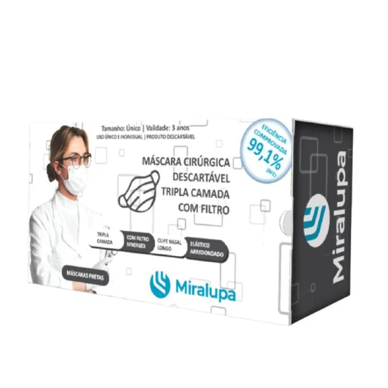Caracteristicas: - Recomendado a troca a cada 4 horas - As mascaras MIRALUPA sao indicadas para barreira contra gotículas, bactérias e inalações de uso individual. - Filtragem bacteriana = ou >99% - Tripla proteção - Clipe nasal anatômico - 100% polipropileno - Hipoalergênica - Não estérilComposição: - 1 camada TNT 20 - 1 camada Synergex Berry 26 gr - 1 camada TNT 20 - Filtro bacteriológico de Alta tecnologia Spunmelt, Retenção de particula comprovada-BFE 99,17%. - Solda Ultrassônica de alta frequência. - Elástico roliço soldado