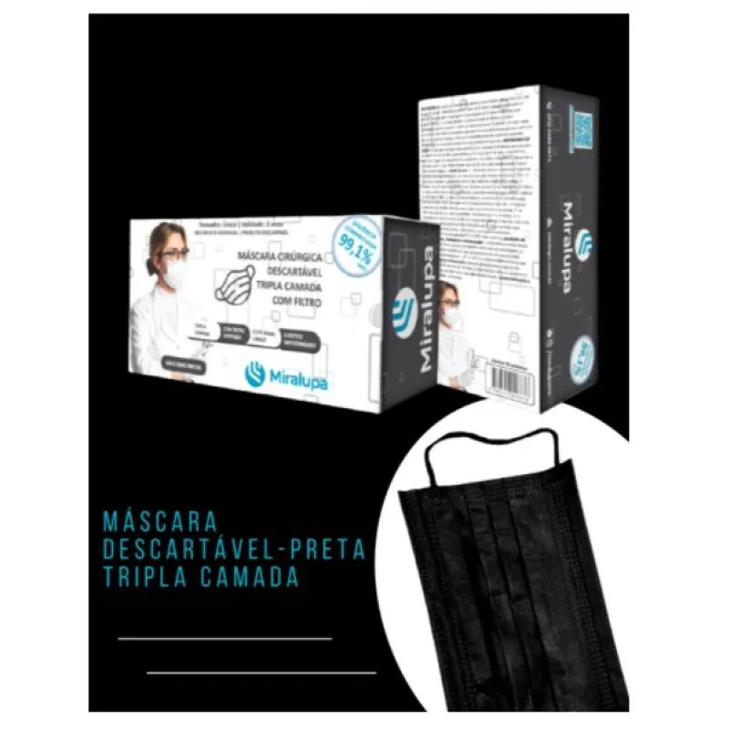Miralupa máscara Cirúrgica Tripla Camada com Filtro -Preta 50un