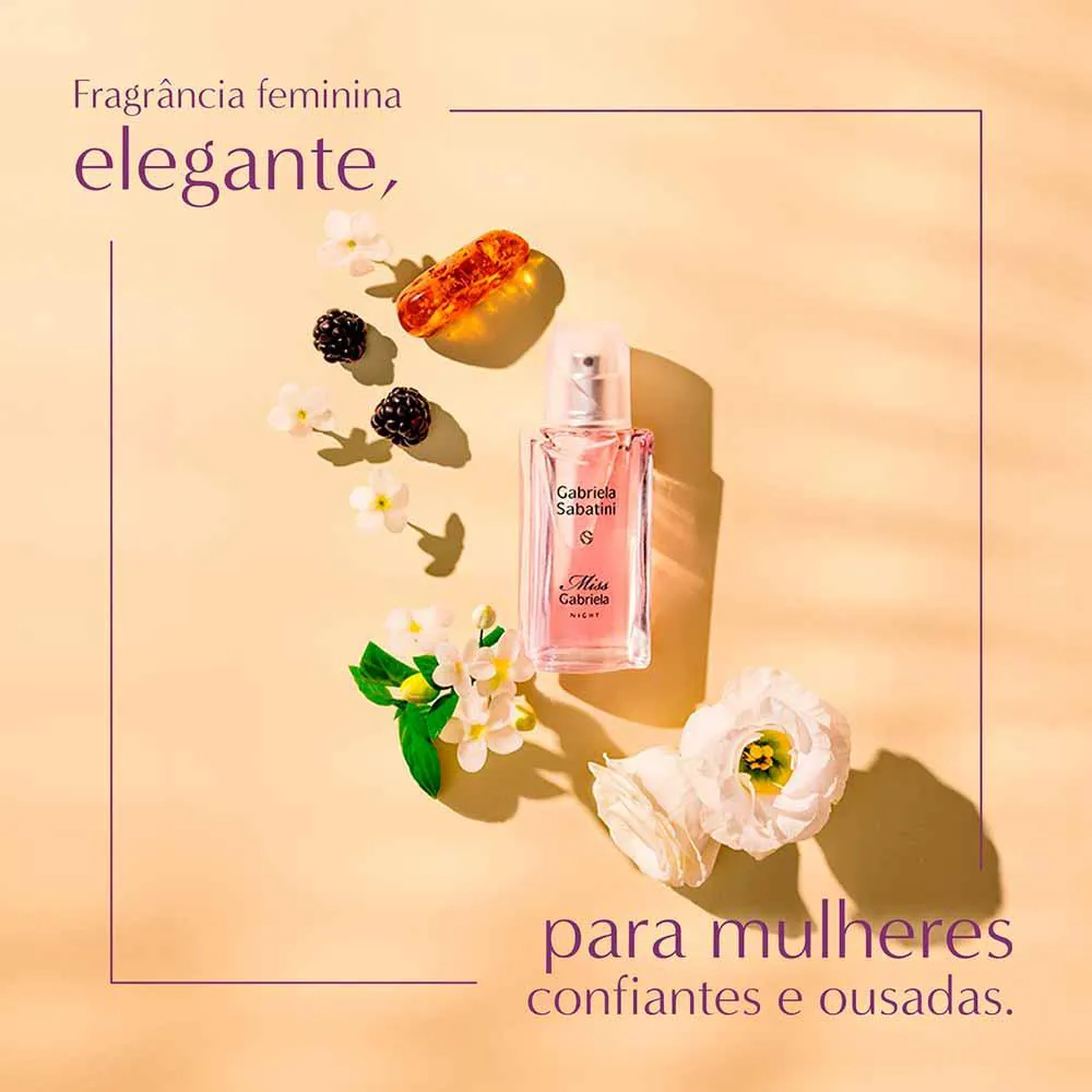 O perfume feminino Miss Gabriela Night da marca Gabriela Sabatini é um floral frutado para mulheres elegantes com o espirito jovem. Um perfume de fragrância vibrante, perfeito para ser usado durante a noite.