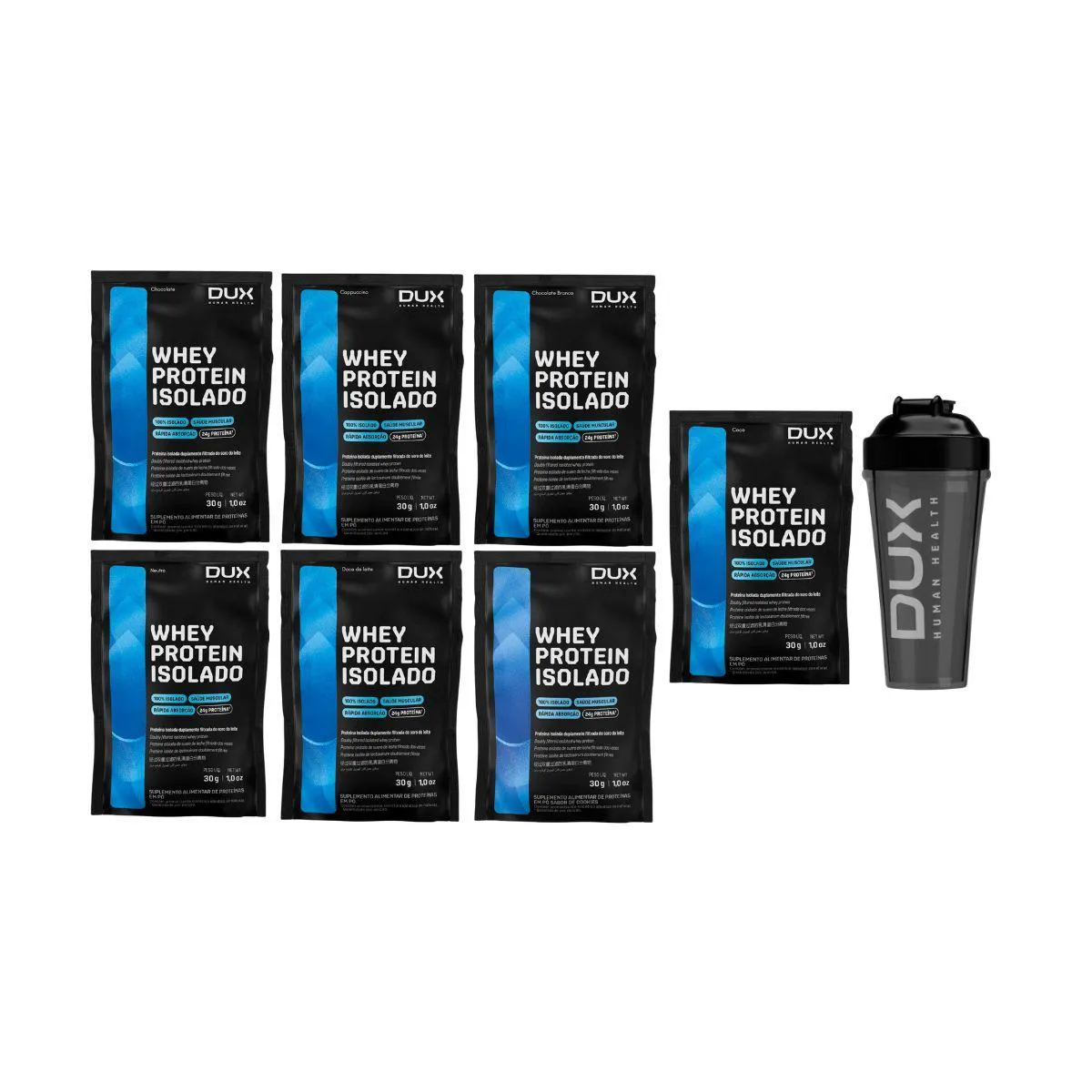 Mix 7 Saches Whey Protein Isolado 24G Proteina + Coqueteleira Dux