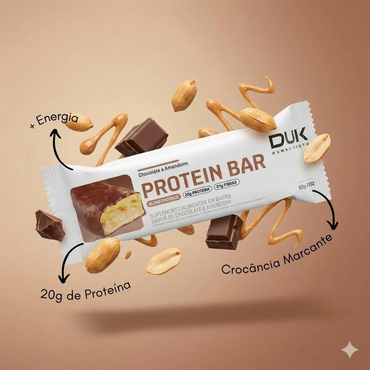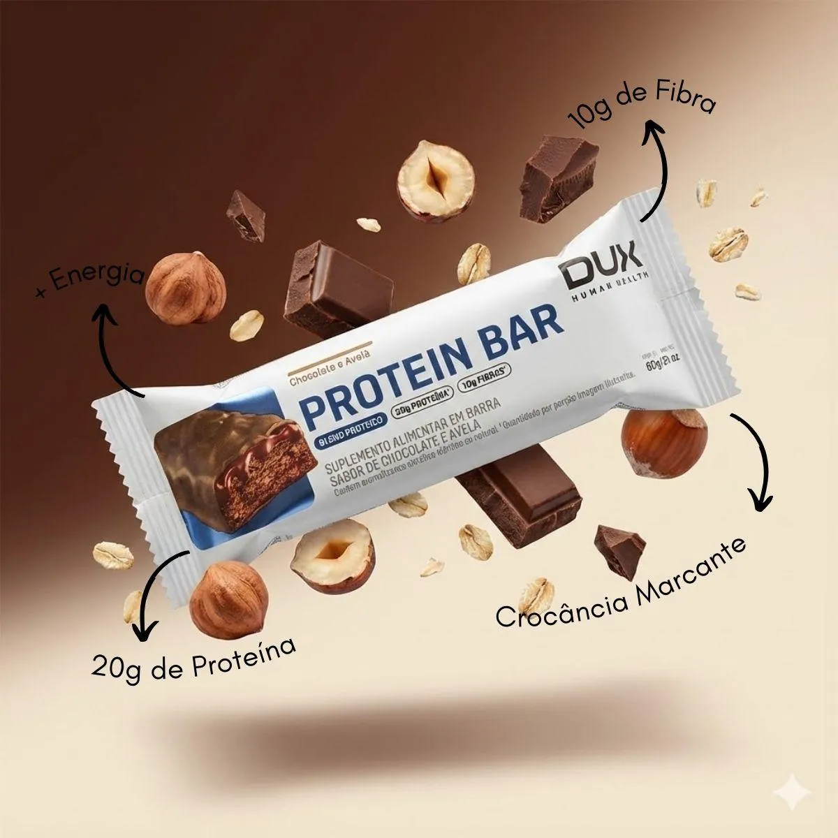 - Barras proteicas crocantes com sabores gourmet.