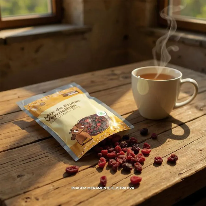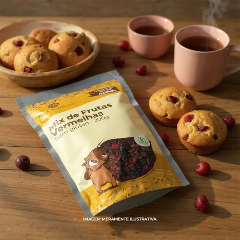 Ingredientes: Goji berry, cranberry, blueberry, cereja glaceada, morango glaceado, cereja glaceada, óleo de girassol, ácido cítrico, açúcar e dióxido de enxofre.