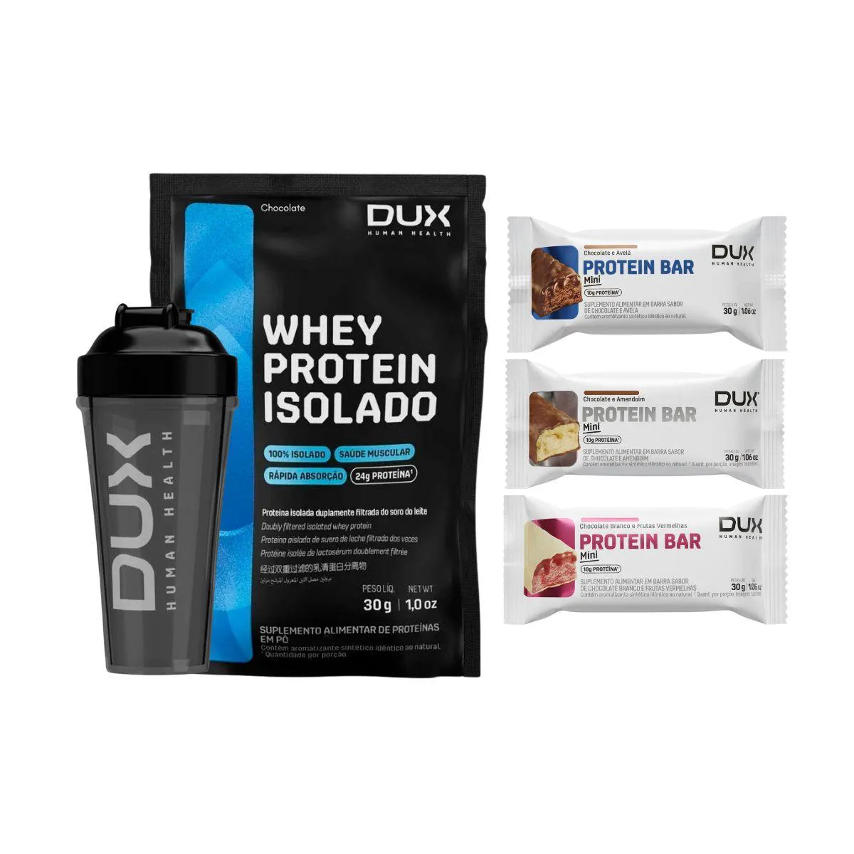 MIX WHEY ISOLADO DUX SACHÊ 30G + 3 BARRAS PROTEINA 10G + COQUETELEIRA DUX 750ML O Kit Completo DUX é a escolha funcional para sua nutrição diária, fornecendo TUDO QUE PRECISA PARA A ROTINA de quem busca ALTA PERFORMACE. Este blend especial combina whey protein ISOLADO SACHÊ (30G) e 3 BARRAS DE PROTEINA para FORÇA, ENERGIA, RECUPERAÇÃO e praticidade. É o kit ideal para o seu TREINO INTENSO, com QUALIDADE DUX e SABOR MARCANTE. DESTAQUES PREMIUM PARA SUA PERFORMACE: Este kit é um produto selecionado de alta QUALIDADE DUX, desenvolvido para quem não abre mão do desempenho e dos resultados. Cada SUPLEMENTO é formulado com pureza e eficácia: WHEY PROTEIN ISOLADO DUX (SACHÊ 30G): Com 24G PROTEINA por dose, 100% PURA, chocolate, é a fonte essencial de PROTEINA ISOLADA para construção e RECUPERAÇÃO do MUSCULO após o TREINO INTENSO. Possui ALTA ABSORÇÃO. 3 BARRAS DE PROTEINA DUX (snacks): Inclui sabores Chocolate e Avelã, Chocolate e Amendoim, e Chocolate Branco e Frutas Vermelhas. Snacks deliciosos e CROCANTEs, ideais para saciedade e ENERGIA extra, ricas COM fibras. PUREZA DUX: Fórmulas rigorosamente limpas e seguras. Sem substâncias ilícitas, sem conservantes, sem corantes artificiais ou ingredientes inferiores. SABOR MARCANTE: Produtos DUX são reconhecidos por seu sabor excepcional, tornando a suplementação um prazer. MARCA RECONHECIDA PELA QUALIDADE: DUX garante que você está fornecendo o melhor para o seu corpo, com TUDO QUE PRECISA PARA A ROTINA. PORQUE ESCOLHER O KIT COMPLETO DUX Este kit completo é o SUPLEMENTO ideal para quem ama cuidar do corpo e da mente, buscando otimização em todas as fases do TREINO INTENSO. A sinergia dos produtos garante: MÚSCULO E FORÇA: Whey Protein e Barras fornecem a PROTEINA necessária para o crescimento e RECUPERAÇÃO do MUSCULO. ENERGIA E PRATICIDADE: barras de proteína são snacks CROCANTEs e FÁCEIS DE PREPARAR E CONSUMIR no dia a dia, ideais para manter a ENERGIA. CONVENIÊNCIA TOTAL: TUDO QUE PRECISA PARA A ROTINA em um único kit. SUGESTÕES DE USO PARA GANHO MÁXIMO DE FORÇA E BEM-ESTAR WHEY PROTEIN: Ingerir 1 sachê (30g) em 200ml de água ou leite após o TREINO INTENSO ou como lanche proteico. BARRAS DE PROTEINA: Consumir uma barra (10G PROTEINA) como lanche, pré-treino ou pós-treino para saciedade e ENERGIA. CARACTERÍSTICAS TÉCNICAS Tipo de Produto: KIT COMPLETO DE SUPLEMENTOS Conteúdo: 1 Sachê Whey Protein Isolado 30G, 3 Barras de Proteina 30G. Diferenciais: PROTEINA ISOLADA, ALTA ABSORÇÃO, BARRAS CROCANTEs COM FIBRAS, SABOR MARCANTE, QUALIDADE DUX, variedade de sabores. ESTOQUE LIMITADO! Garanta o seu Kit Completo DUX com QUALIDADE DUX agora e transforme sua PERFORMACE PARA O TREINO. Aproveite o preço especial e tenha TUDO QUE PRECISA PARA A ROTINA! Aviso legal Consumir junto com alimentos para facilitar a assimilação. Este produto é um SUPLEMENTO dietético, não um medicamento. Suplementa dietas insuficientes. Consulte o seu médico e/ou farmacêutico.