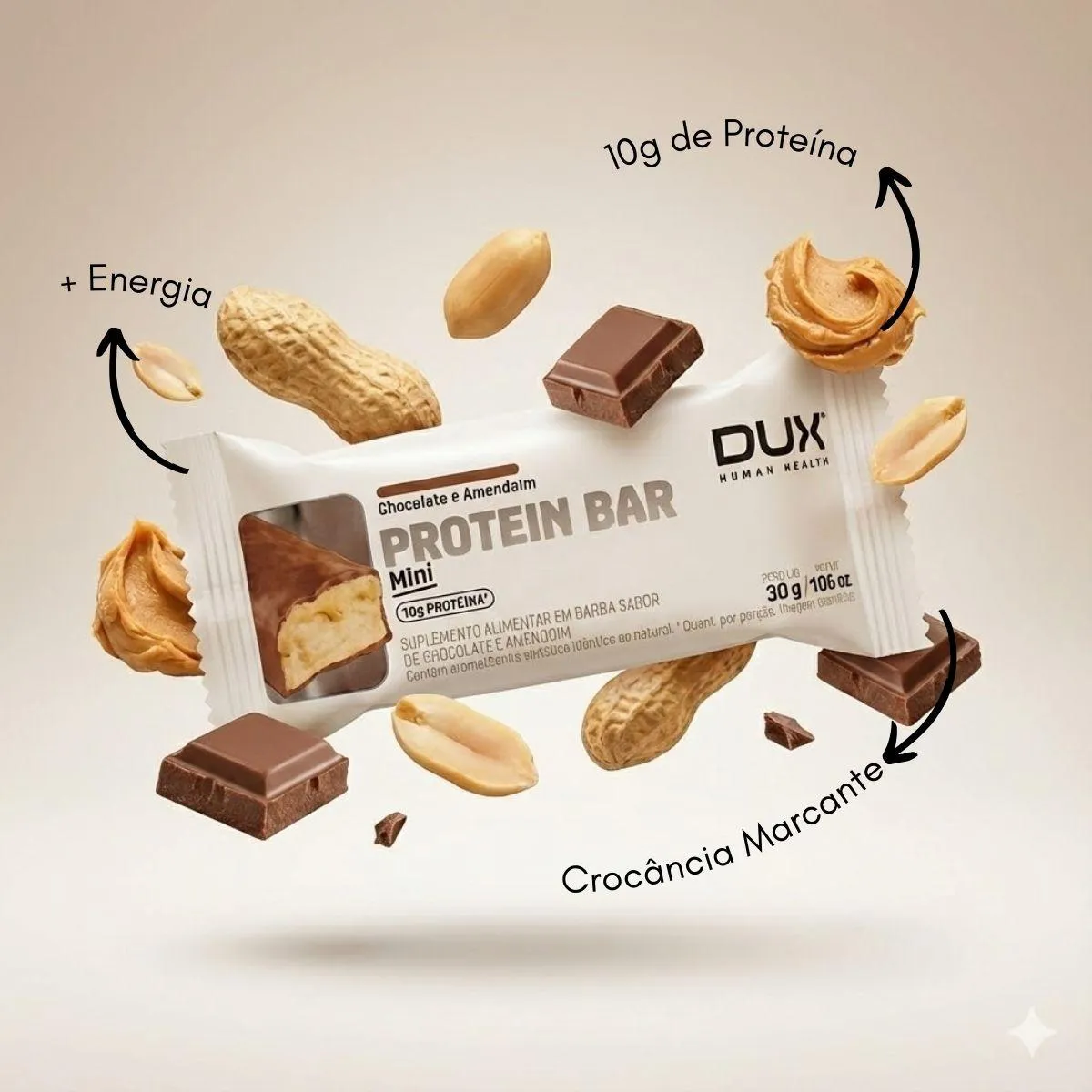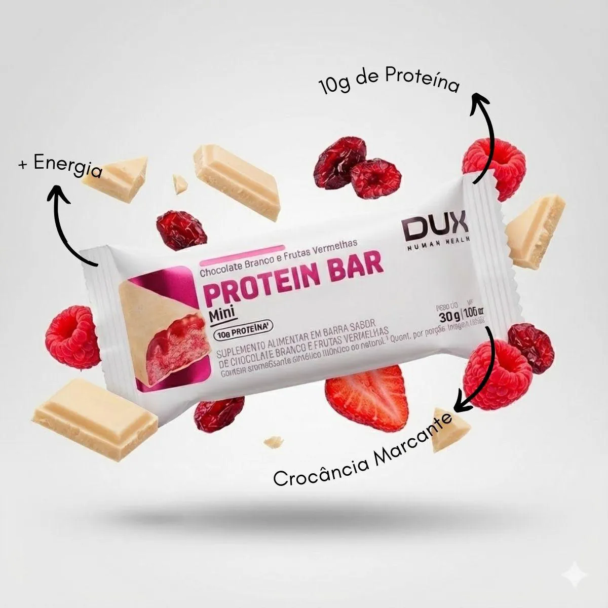 - Consumir uma barra (10G PROTEINA) como lanche, pré-treino ou pós-treino para saciedade e energia.