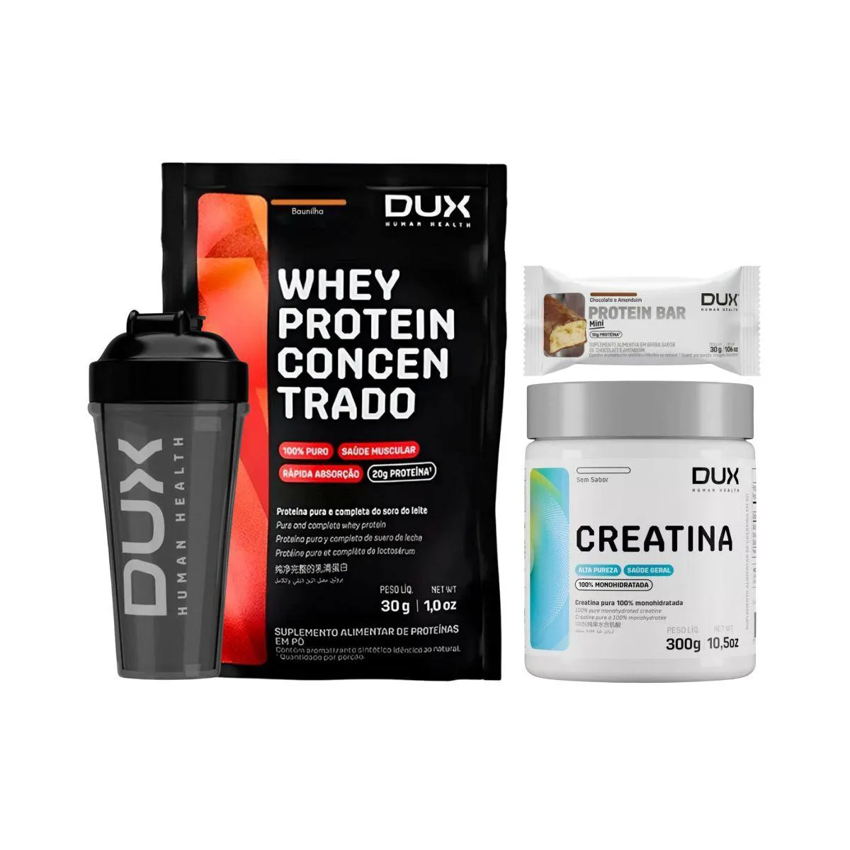 O que é e para que serve o Kit Whey Concentrado DUX Sachê 30G + creatina 300G + Barra Proteina + Coqueteleira DUX 750ML?
