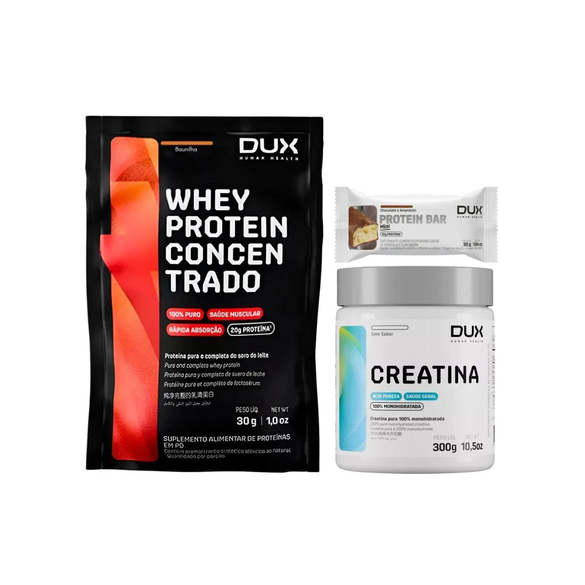 MIX WHEY CONCENTRADO DUX SACHÊ 30G + creatina 300G + BARRA PROTEINA O Mix Completo DUX é a escolha funcional para sua nutrição diária, fornecendo TUDO QUE PRECISA PARA A ROTINA de quem busca ALTA PERFORMACE. Este blend especial combina whey protein CONCENTRADO SACHÊ (30G), CREATINA MONOHIDRATADA (300G) e BARRA DE PROTEINA para FORÇA, ENERGIA, RECUPERAÇÃO e DESEMPENHO. É o kit ideal para o seu TREINO INTENSO, com QUALIDADE DUX e SABOR MARCANTE. DESTAQUES PREMIUM PARA SUA PERFORMACE: Este kit é um produto selecionado de alta QUALIDADE DUX, desenvolvido para quem não abre mão do desempenho e dos resultados. Cada SUPLEMENTO é formulado com pureza e eficácia: WHEY PROTEIN CONCENTRADO DUX (SACHÊ 30G): Com 20G PROTEINA por dose, 100% PURA, chocolate, é a fonte essencial de PROTEINA CONCENTRADA para construção e RECUPERAÇÃO do MUSCULO após o TREINO INTENSO. Possui ALTA ABSORÇÃO. CREATINA MONOHIDRATADA DUX (300G): FÓRMULA LEVE E 100% PURA, ideal para aumento de FORÇA, resistência e recuperação muscular durante o TREINO INTENSO. BARRA DE PROTEINA DUX (Snack): Barra de 10G PROTEINA (Chocolate Branco e Frutas Vermelhas), um snack delicioso e CROCANTE, ideal para saciedade e ENERGIA extra, rica COM fibras. PUREZA DUX: Fórmulas rigorosamente limpas e seguras. Sem substâncias ilícitas, sem conservantes, sem corantes artificiais ou ingredientes inferiores. SABOR MARCANTE: Produtos DUX são reconhecidos por seu sabor excepcional, tornando a suplementação um prazer. MARCA RECONHECIDA PELA QUALIDADE: DUX garante que você está fornecendo o melhor para o seu corpo, com TUDO QUE PRECISA PARA A ROTINA. PORQUE ESCOLHER O KIT COMPLETO DUX Este kit completo é o SUPLEMENTO ideal para quem ama cuidar do corpo e da mente, buscando otimização em todas as fases do TREINO INTENSO. A sinergia dos produtos garante: MÚSCULO E FORÇA: Whey Protein e Creatina fornecem a PROTEINA e o suporte necessários para o crescimento, FORÇA e RECUPERAÇÃO do MUSCULO. ENERGIA E PRATICIDADE: A barra de proteína é um snack CROCANTE e FÁCIL DE PREPARAR E CONSUMIR no dia a dia, ideal para manter a ENERGIA. CONVENIÊNCIA TOTAL: TUDO QUE PRECISA PARA A ROTINA em um único kit. SUGESTÕES DE USO PARA GANHO MÁXIMO DE FORÇA E BEM-ESTAR WHEY PROTEIN: Ingerir 1 sachê (30g) em 200ml de água ou leite após o TREINO INTENSO ou como lanche proteico. CREATINA: Consumir 1 dose (3g) com 200ml de água, preferencialmente antes ou depois do TREINO INTENSO. BARRA DE PROTEINA: Consumir uma barra (10G PROTEINA) como lanche, pré-treino ou pós-treino para saciedade e ENERGIA. CARACTERÍSTICAS TÉCNICAS Tipo de Produto: KIT COMPLETO DE SUPLEMENTOS Conteúdo: 1 Sachê Whey Protein Concentrado 30G, 1 Creatina Monohidratada 300G, 1 Barra de Proteina 30G. Diferenciais: PROTEINA CONCENTRADA, ALTA ABSORÇÃO, CREATINA 100% PURA, BARRA CROCANTE COM FIBRAS, SABOR MARCANTE, QUALIDADE DUX. ESTOQUE LIMITADO! Garanta o seu Kit Completo DUX com QUALIDADE DUX agora e transforme sua PERFORMACE PARA O TREINO. Aproveite o preço especial e tenha TUDO QUE PRECISA PARA A ROTINA! Aviso legal Consumir junto com alimentos para facilitar a assimilação. Este produto é um SUPLEMENTO dietético, não um medicamento. Suplementa dietas insuficientes. Consulte o seu médico e/ou farmacêutico.
