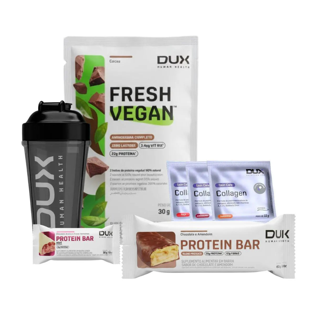 MIX FRESH VEGAN DUX 30G + 2 BARRAS + 3 COLLAGENS SACHÊS + COQUETELEIRA DUX 750ML