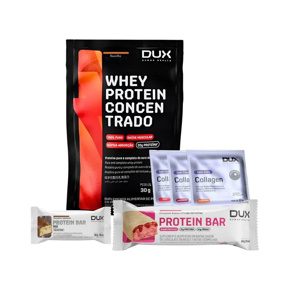 MIX WHEY CONCENTRADO DUX 900G + 2 BARRAS + 3 COLLAGENS SACHÊS