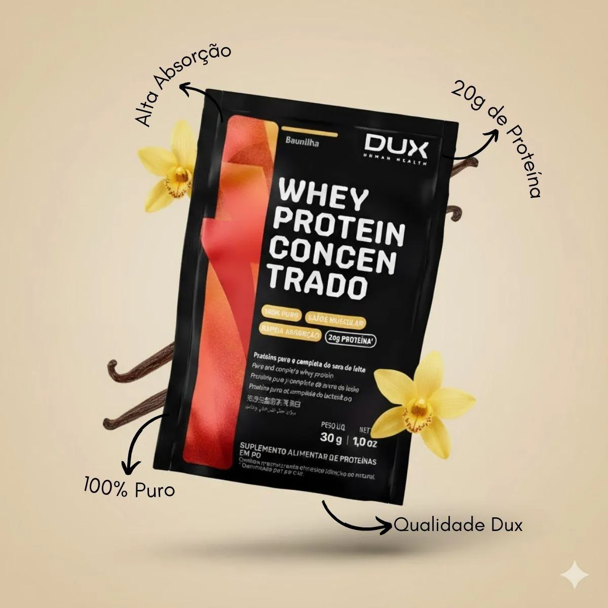 O Whey Protein Concentrado é um suplemento proteico em sachê de 30g, com 20g de proteína por dose, desenvolvido para construção e recuperação muscular após treinos intensos. Possui alta absorção e sabor chocolate.