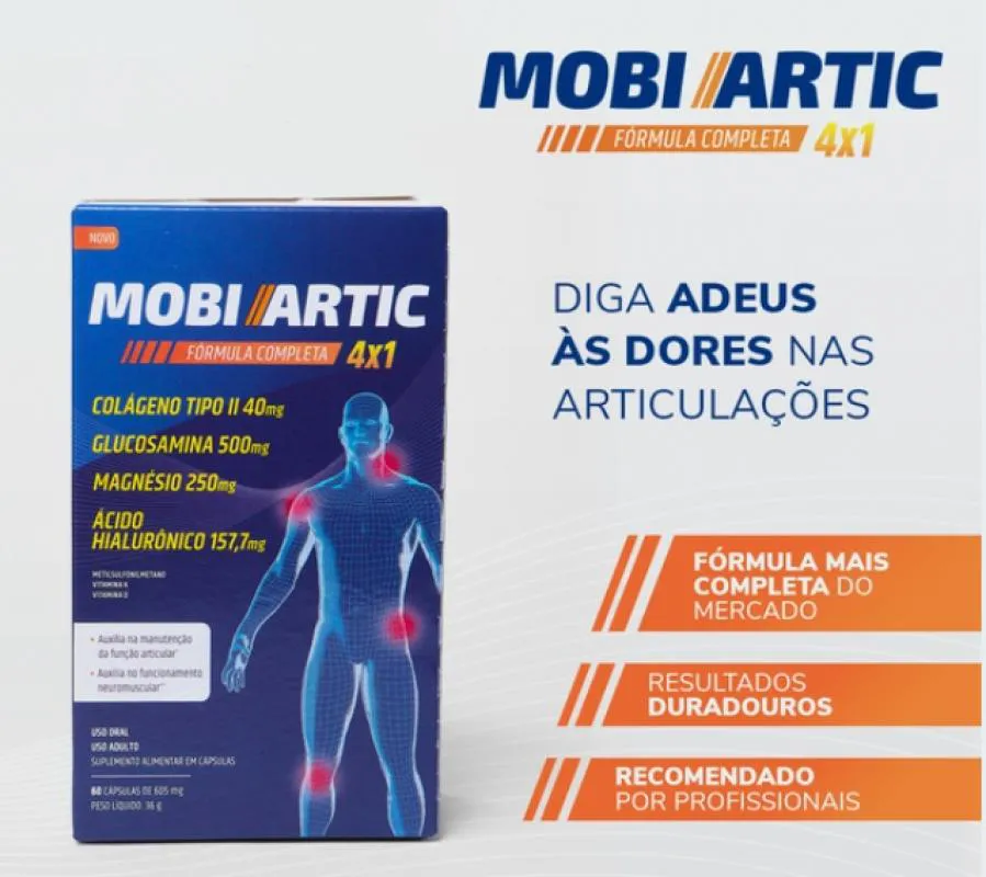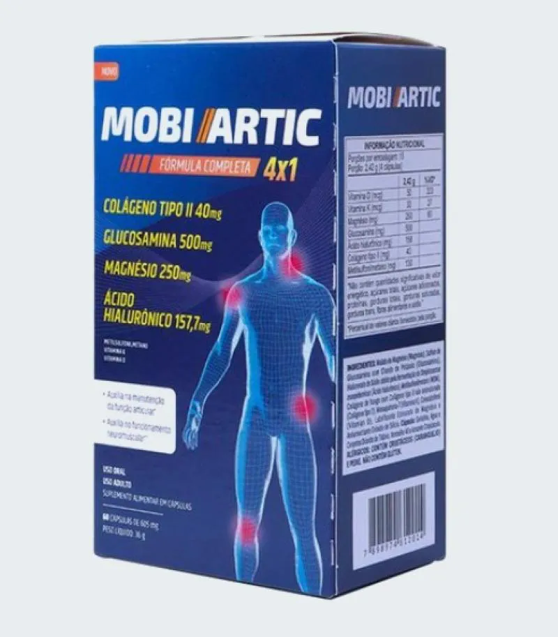 Mobiartic é um suplemento alimentar desenvolvido pela Canonne, formulado para auxiliar na saúde das articulações, flexibilidade e mobilidade corporal. Sua composição combina ingredientes de alta eficácia como Glucosamina, Ácido Hialurônico, colágeno Tipo II e Metilsulfonilmetano (MSM), além de vitaminas e minerais essenciais que atuam de forma sinérgica na manutenção e proteção das cartilagens. Indicado para quem busca prevenir desconfortos articulares, melhorar a lubrificação das articulações e preservar a integridade do tecido cartilaginoso, seja para manter o bem-estar nas atividades diárias ou para quem realiza atividades físicas regulares.