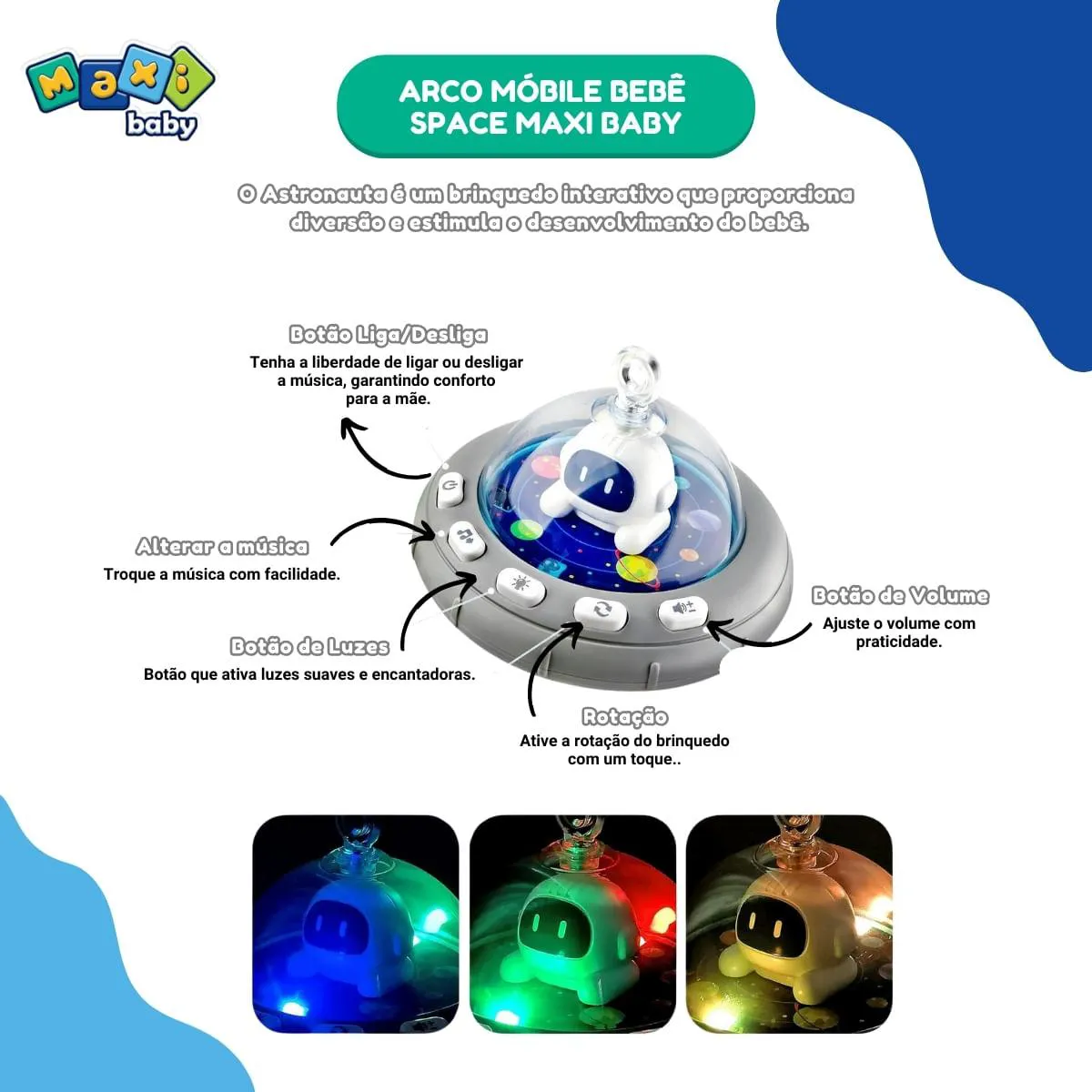 - Acione os recursos de música e luz para estimular o bebê.
