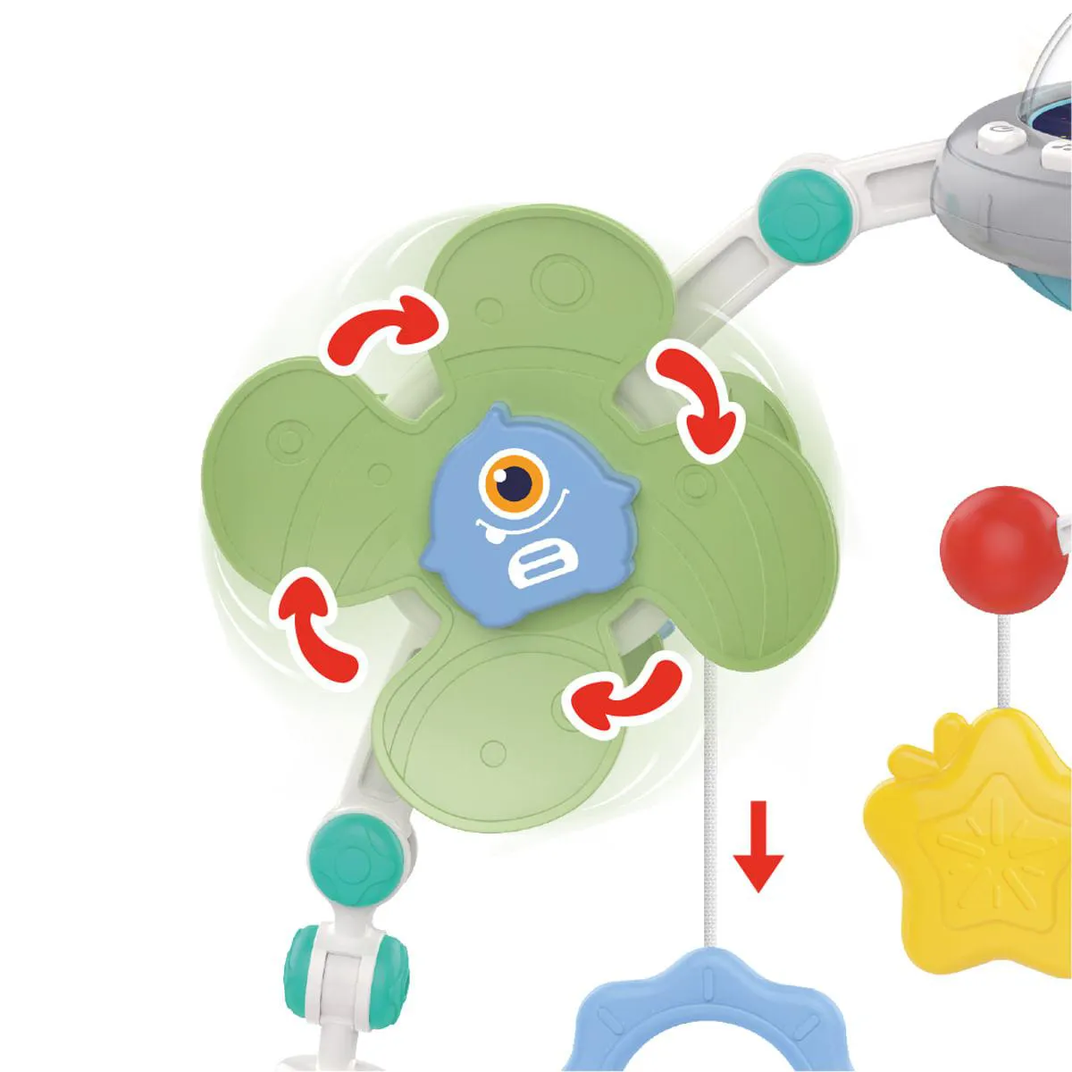 - Permita que o bebê explore os diferentes elementos: moinho de vento giratório, chocalho, anel de dentição e espelho.